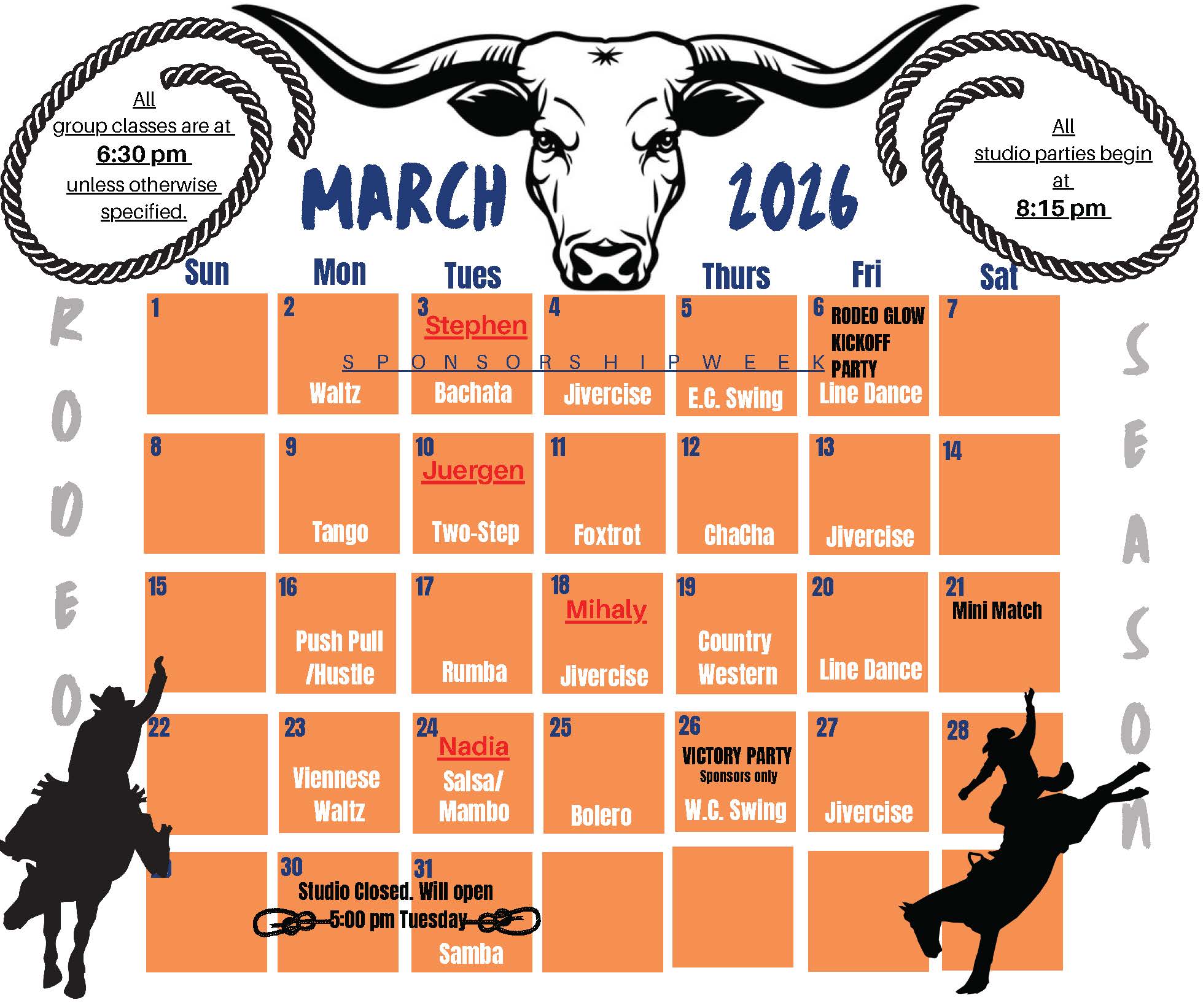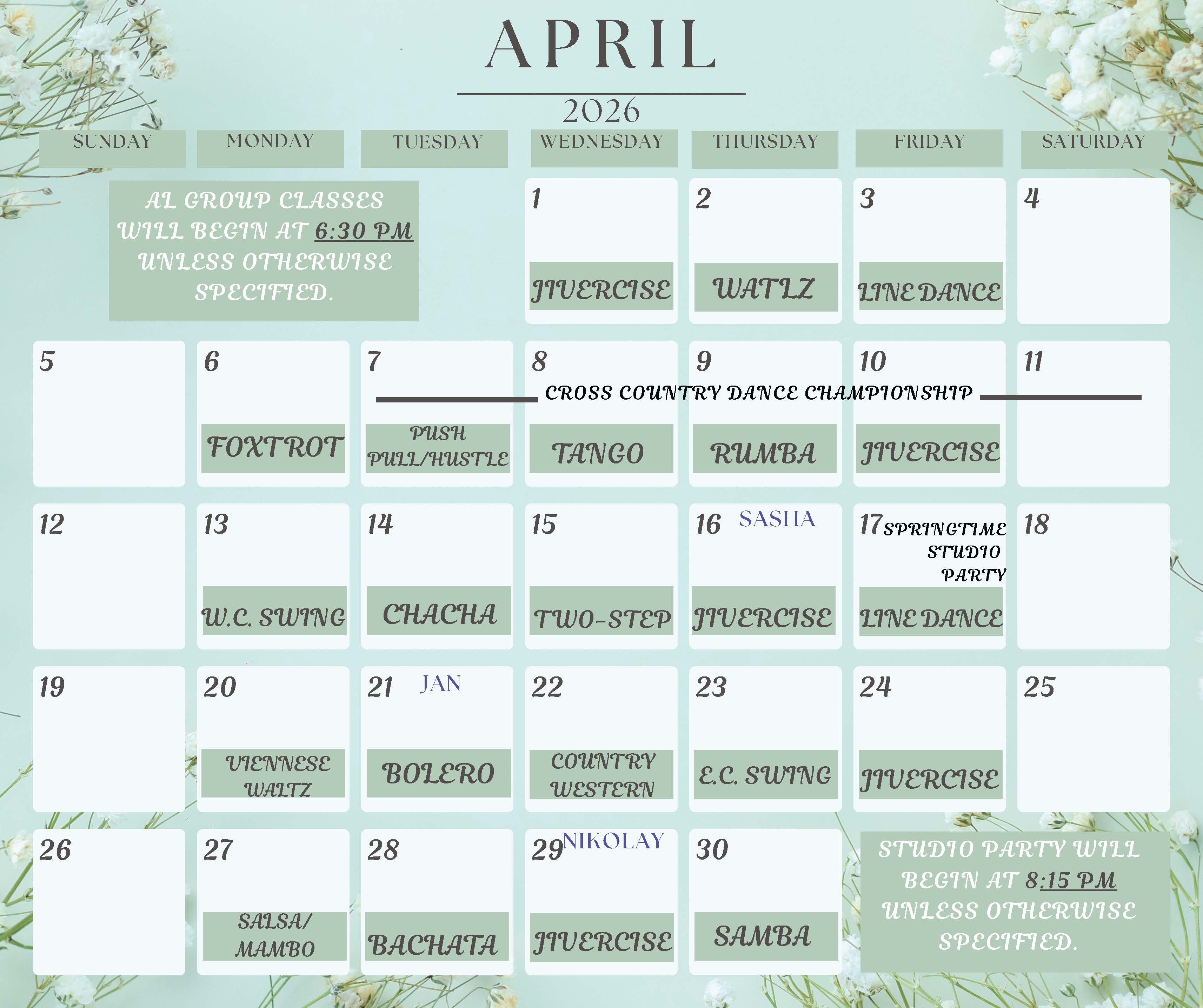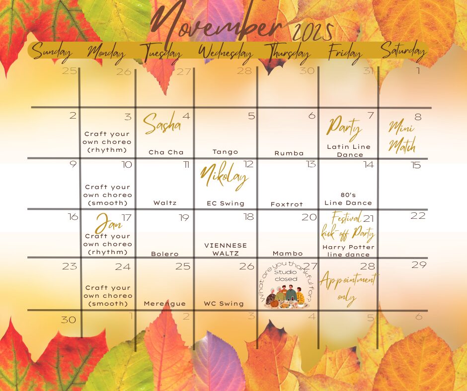 Our group class and party calendar for our current students are shown below. Please ask your instructor for more details on what classes they recommend you attend!