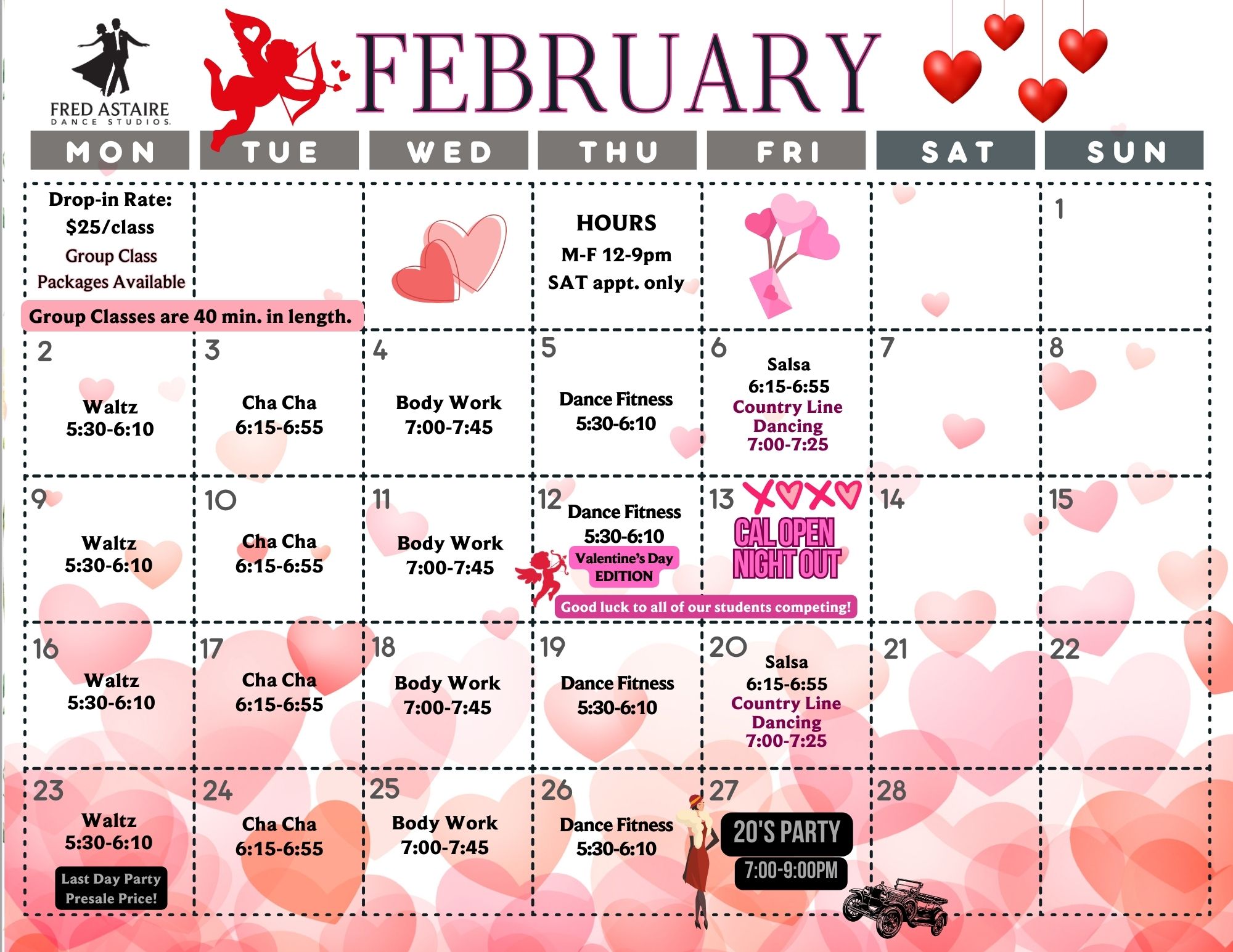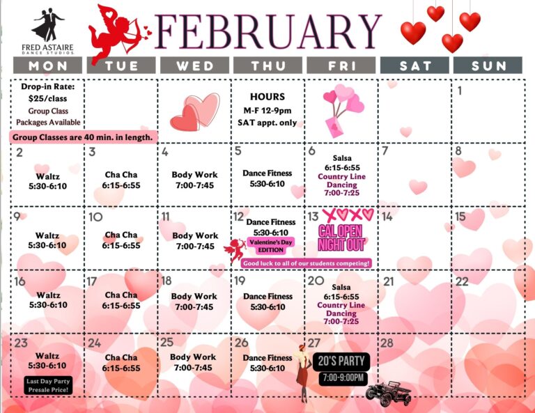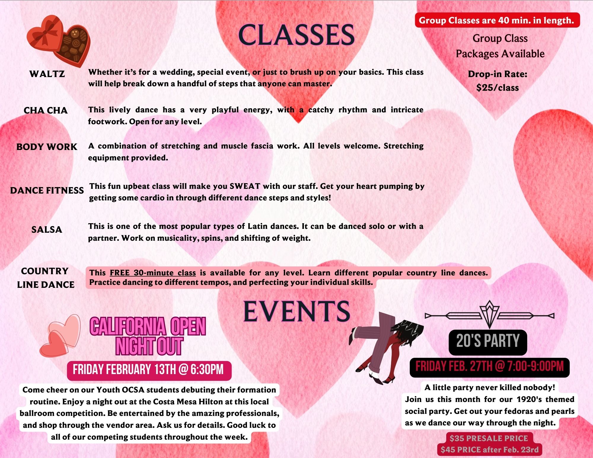 Check out this month’s schedule of Group Classes, Practice Parties and Special Events at our Studio. Come with a dance partner or by yourself. For more information and to join us, just give us a call!