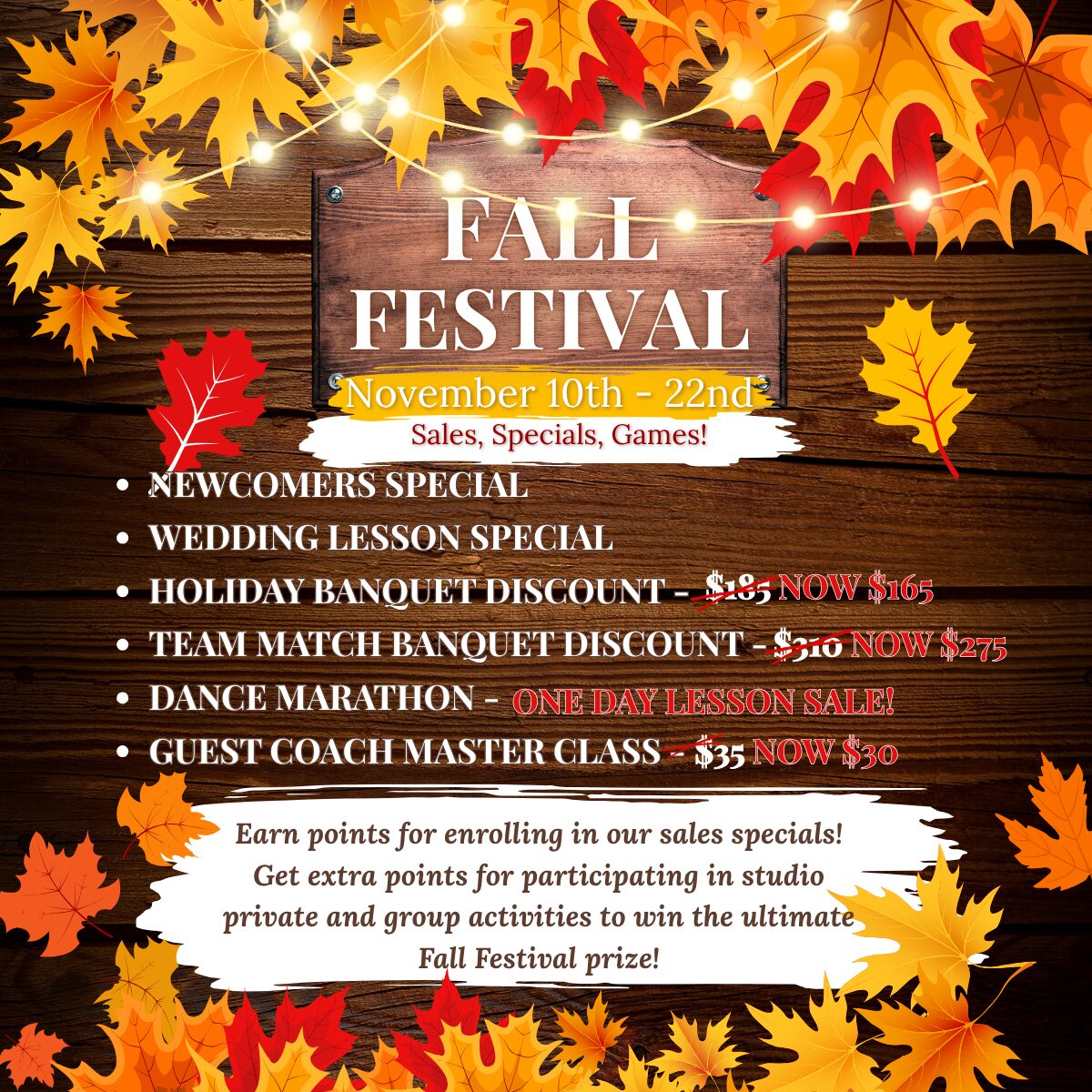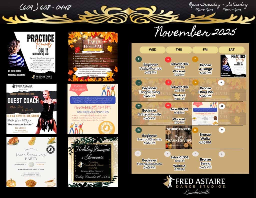 Check out this month’s schedule of Group Classes, Parties, and Special Events at our Studio. No partner required! For more information or to join us, just give us a call!