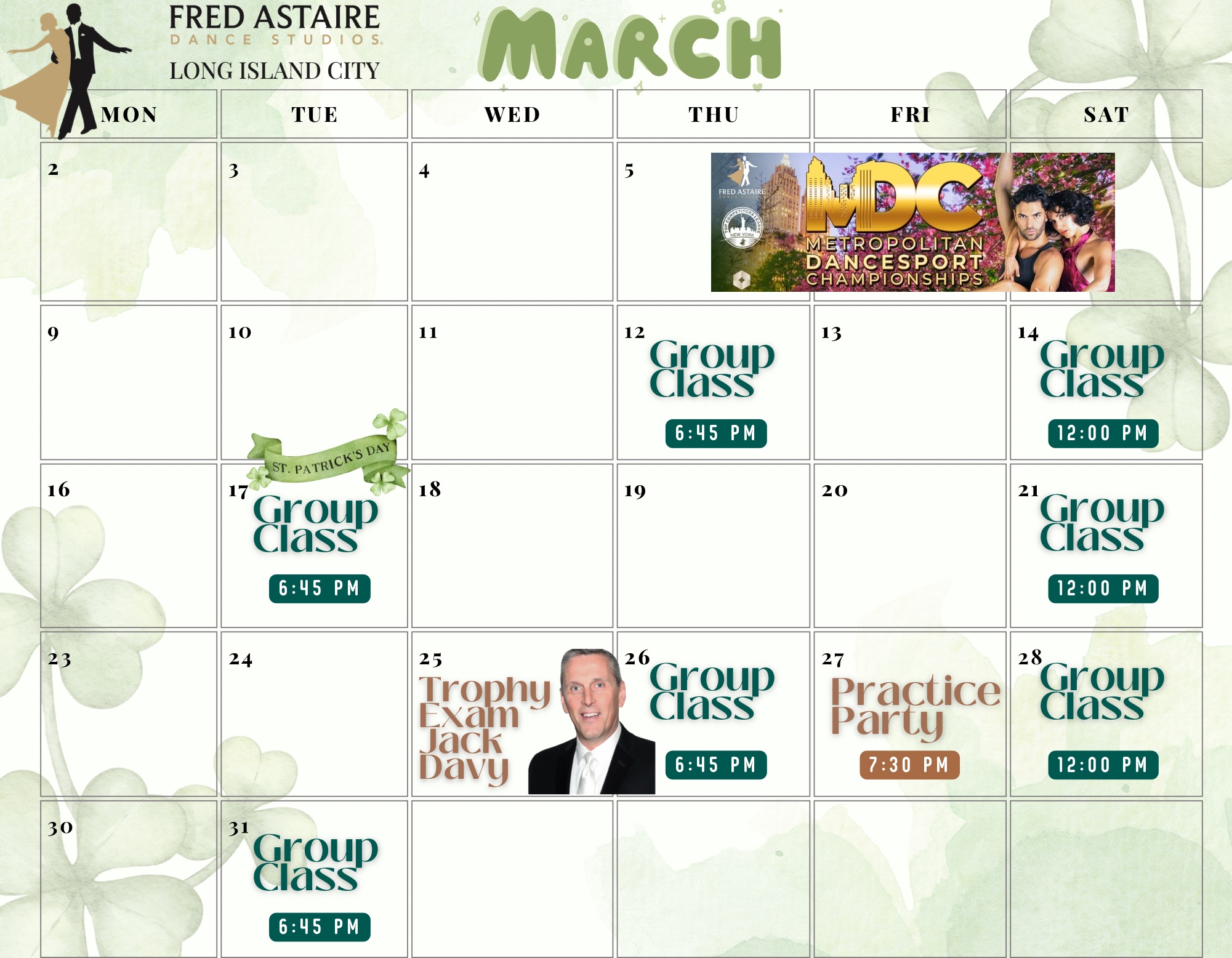 Below you will find our monthly calendar of events for Fred Astaire Dance Studio of Long Island City, including group classes, practice parties, and special events!