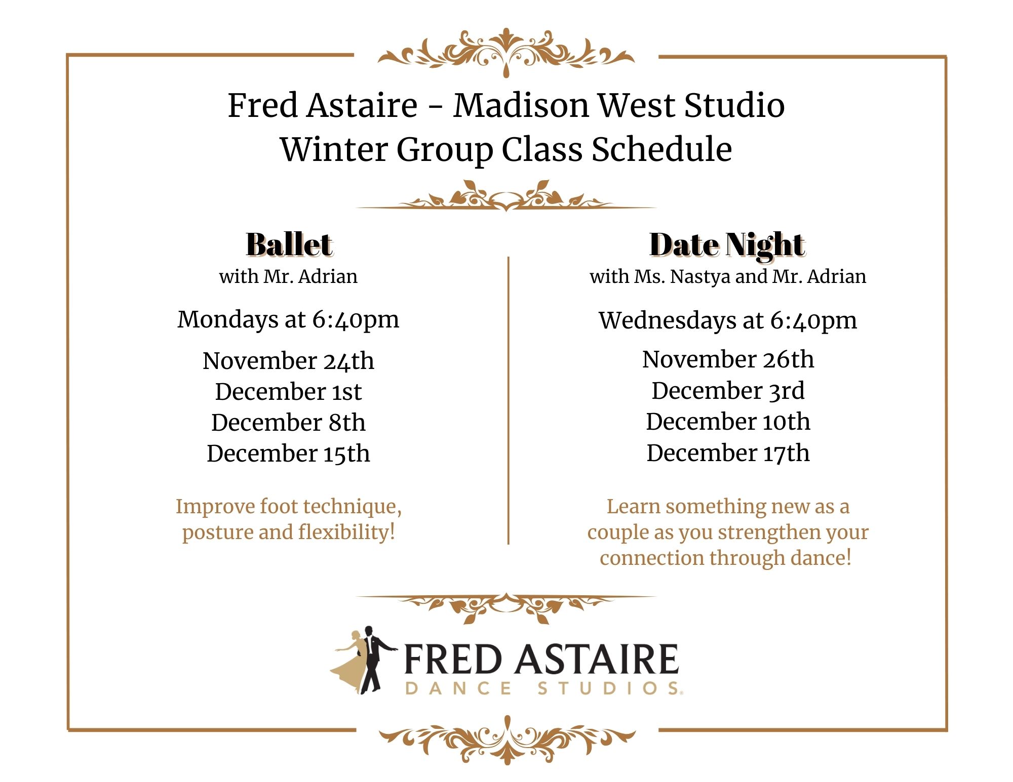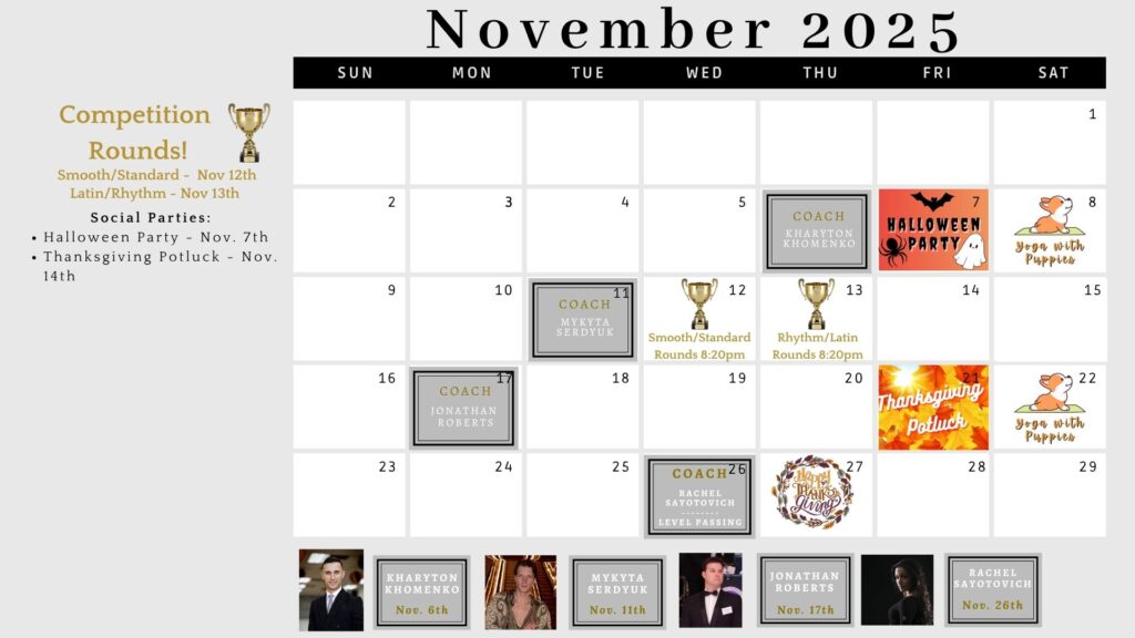 Check out this month’s schedule of Group Classes, Practice Parties and Special Events at our Studio. Come with a dance partner or by yourself. If you’d like more information, or to join us, just give us a call!