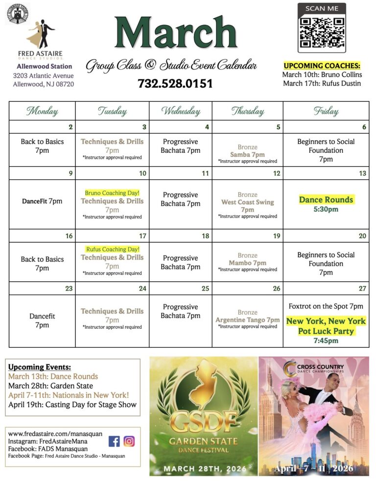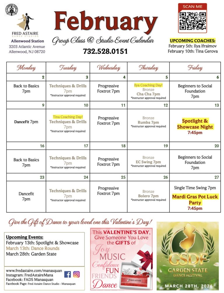 Our Monthly Calendar reflects Group Classes which are held throughout the week as well as studio parties and regional events. Private Lessons can be scheduled anytime Monday-Friday from 12pm-9pm and Saturdays by appointment!