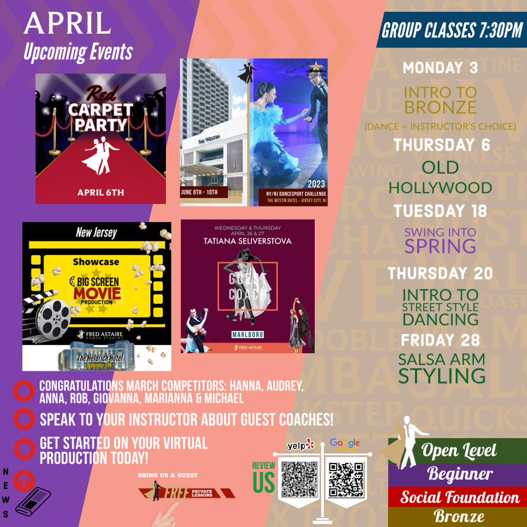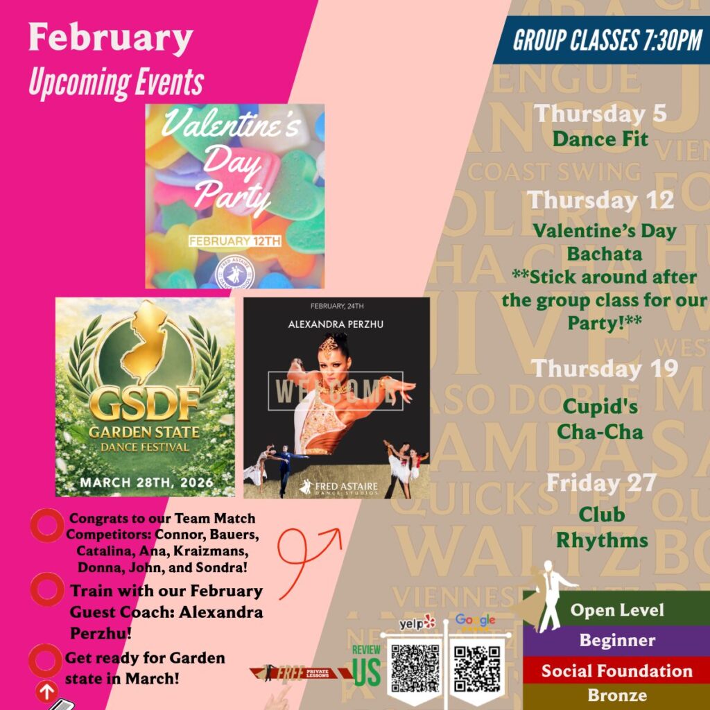 Check out this month’s schedule of Group Classes, Practice Parties and Special Events at our Studio. Please be sure to speak with your Instructors before attending – as each group lesson is catered toward specific dance levels.