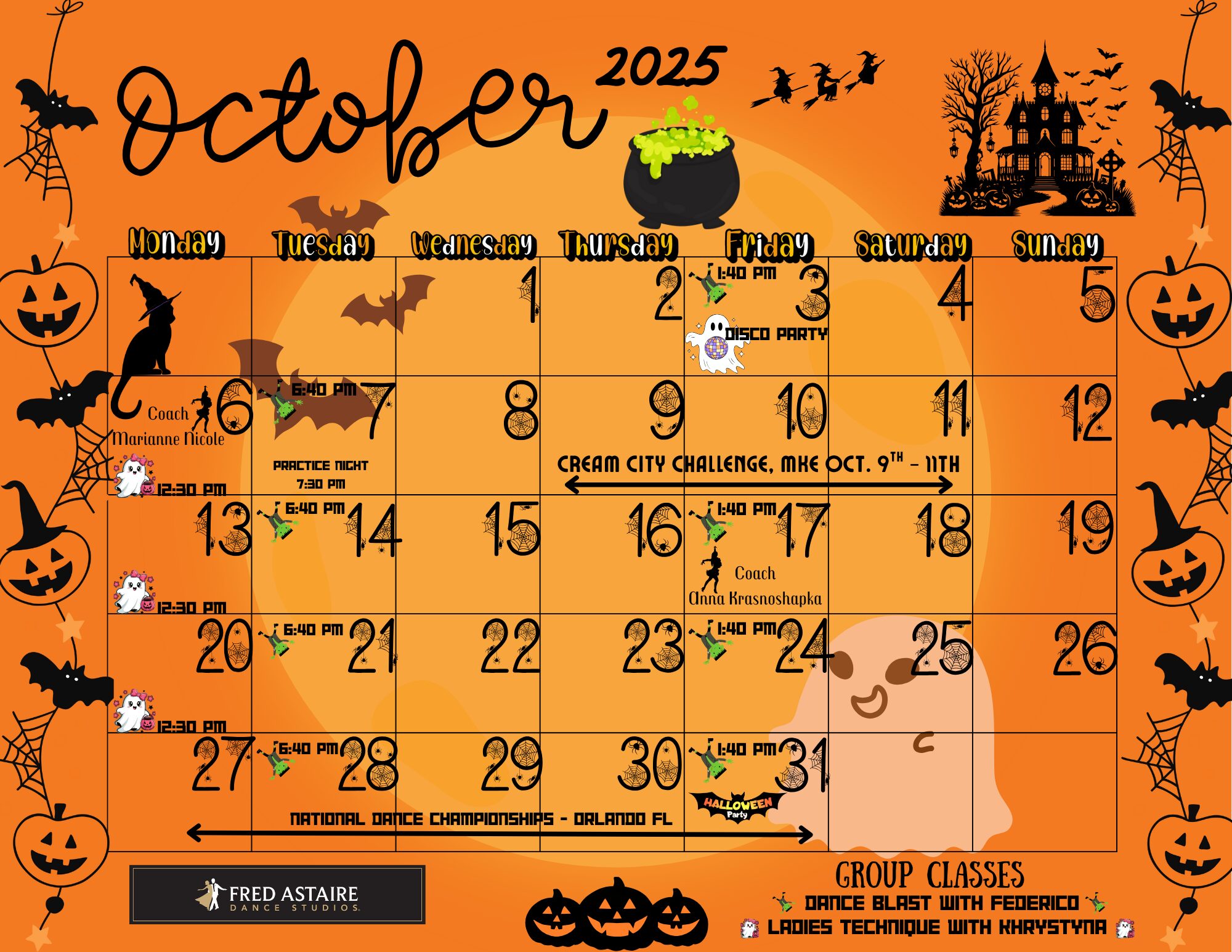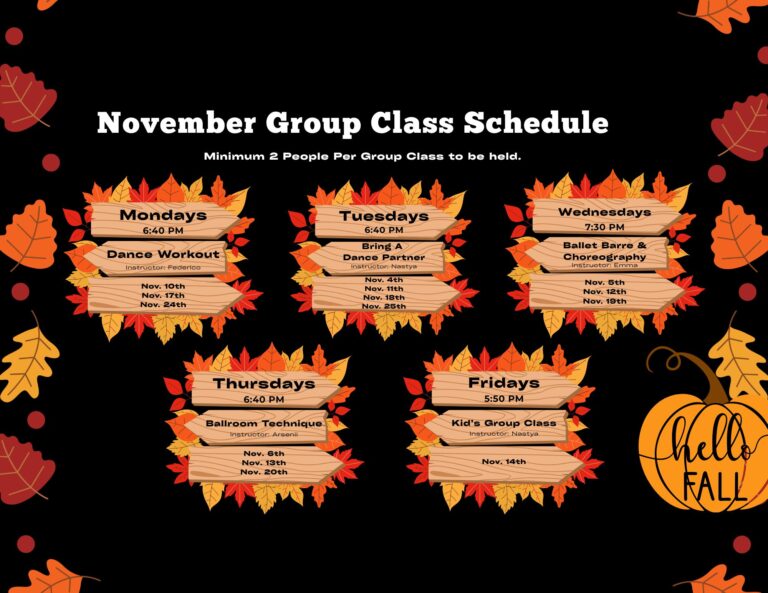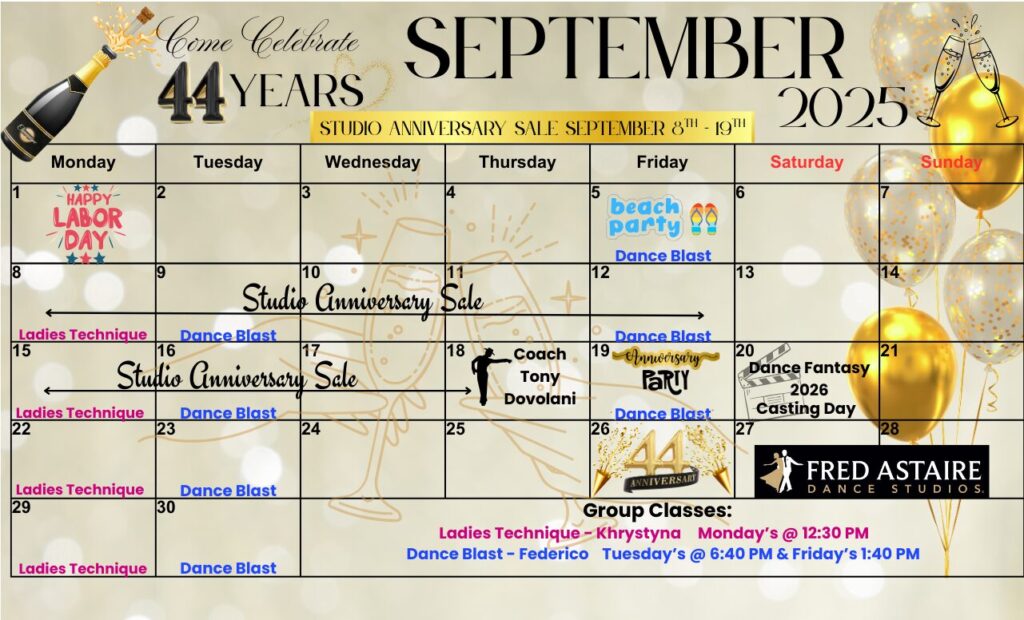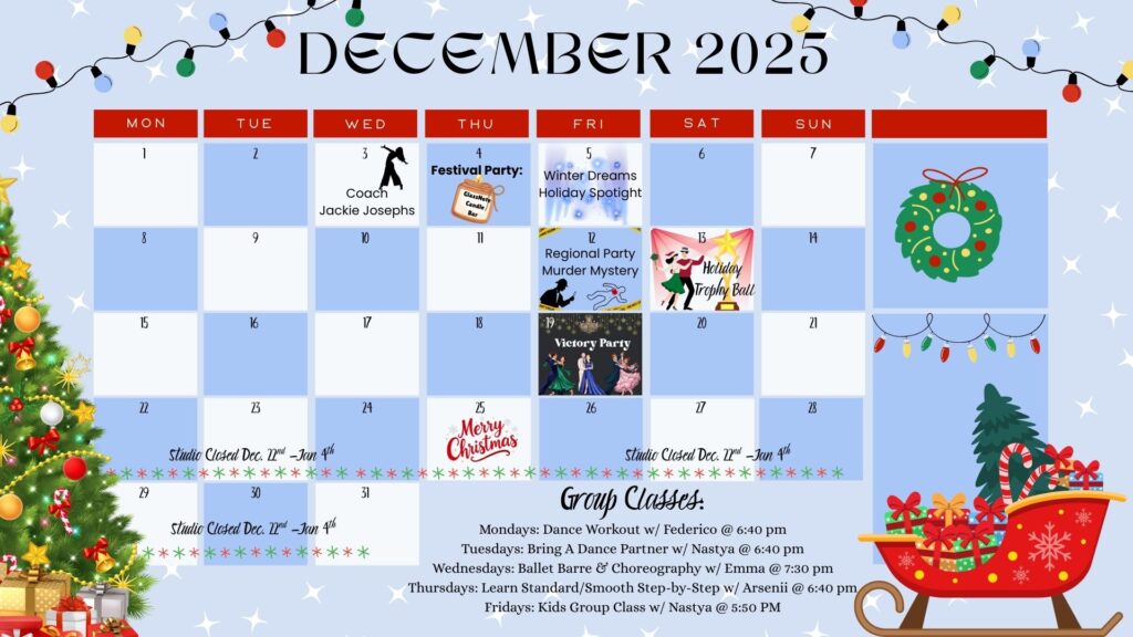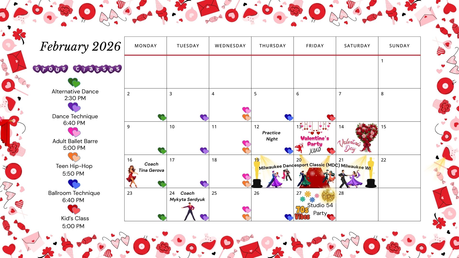 Check out this month’s schedule of Group Classes, Practice Parties and Special Events at our studio. Come with a dance partner or by yourself. For more information and to join us, just give us a call at 262-241-1221 or send us an email [email protected]!