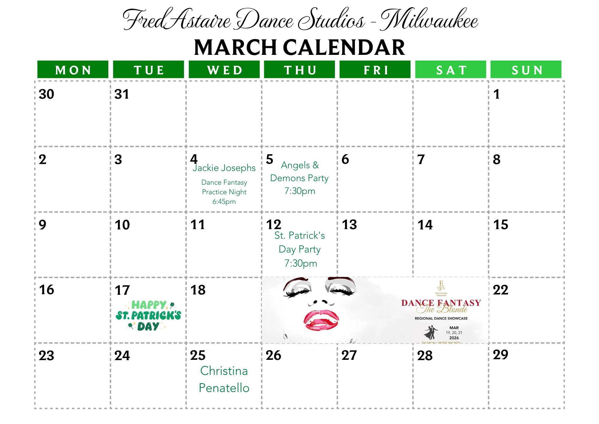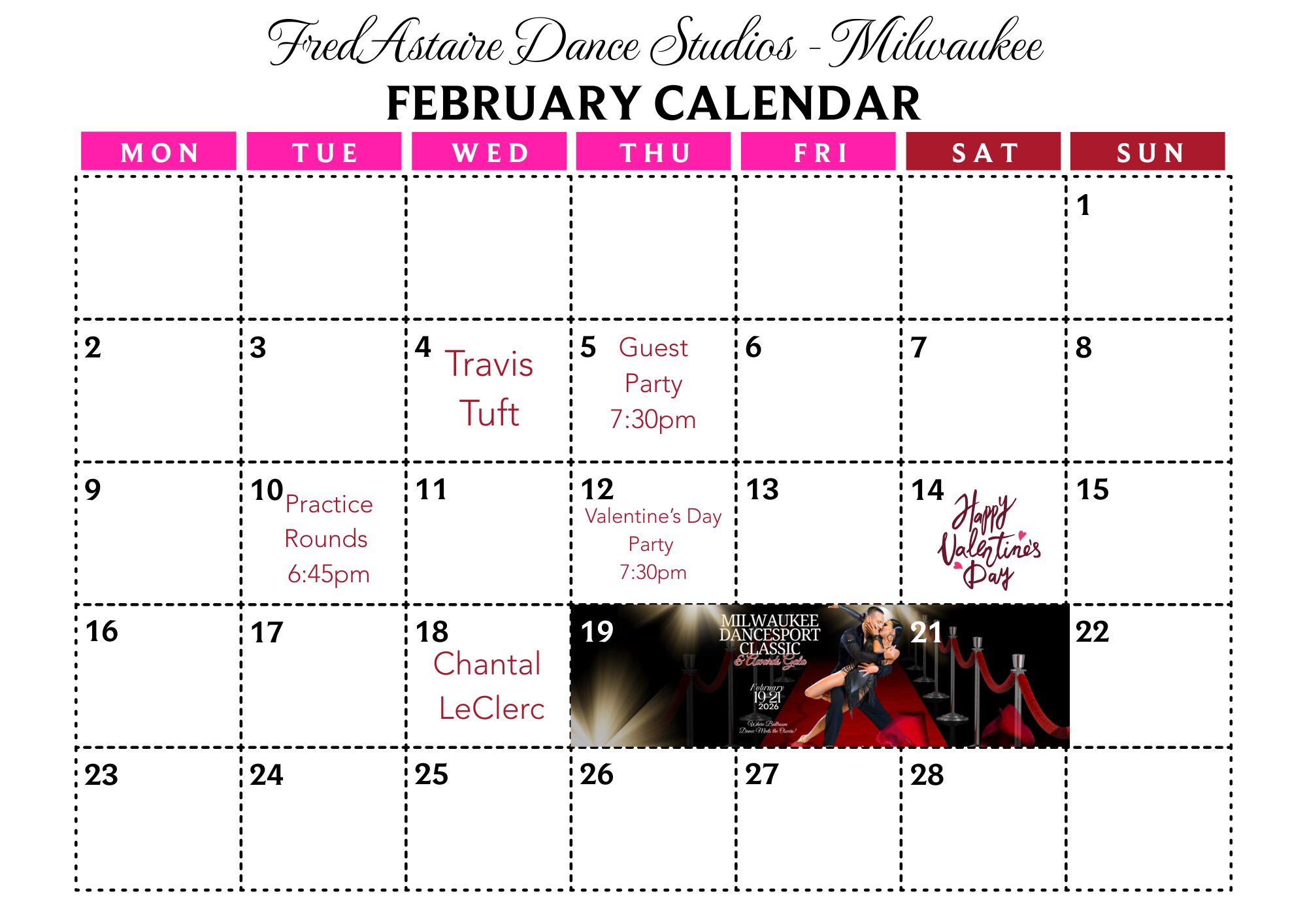 Check out this month’s schedule of Group Classes, Practice Parties and Special Events at our studio. Come with a dance partner or by yourself. For more information and to join us, just give us a call at 414-291-9999 or send us an email [email protected]!