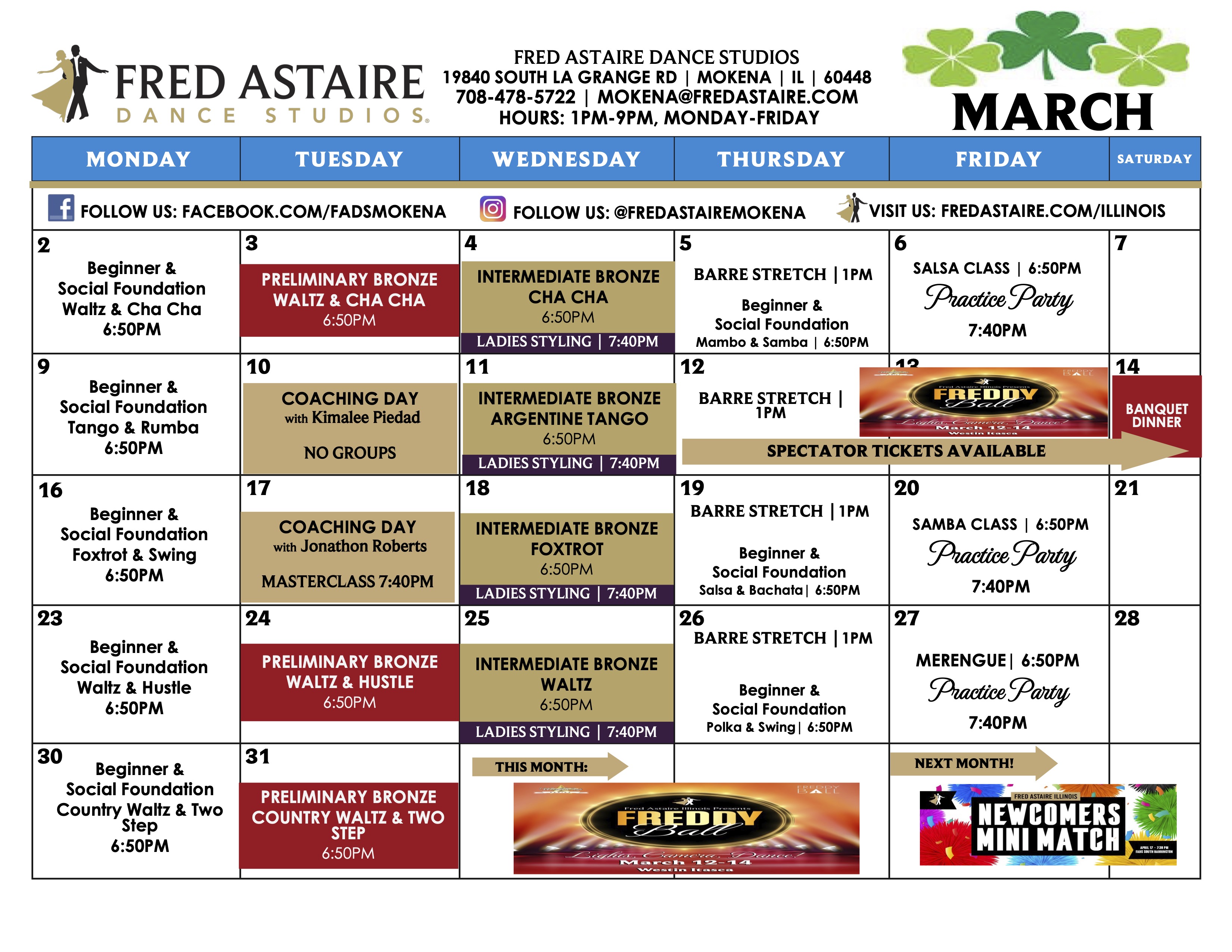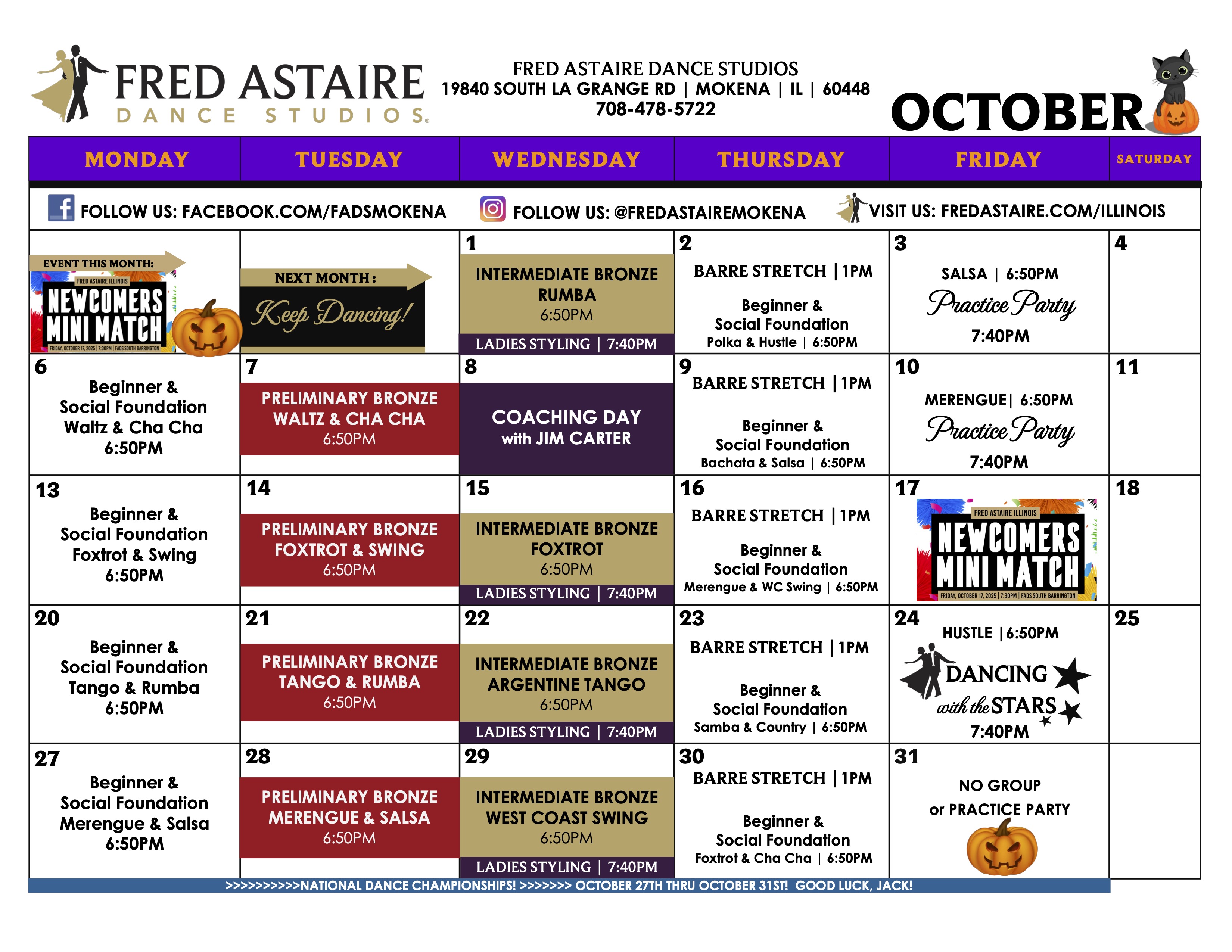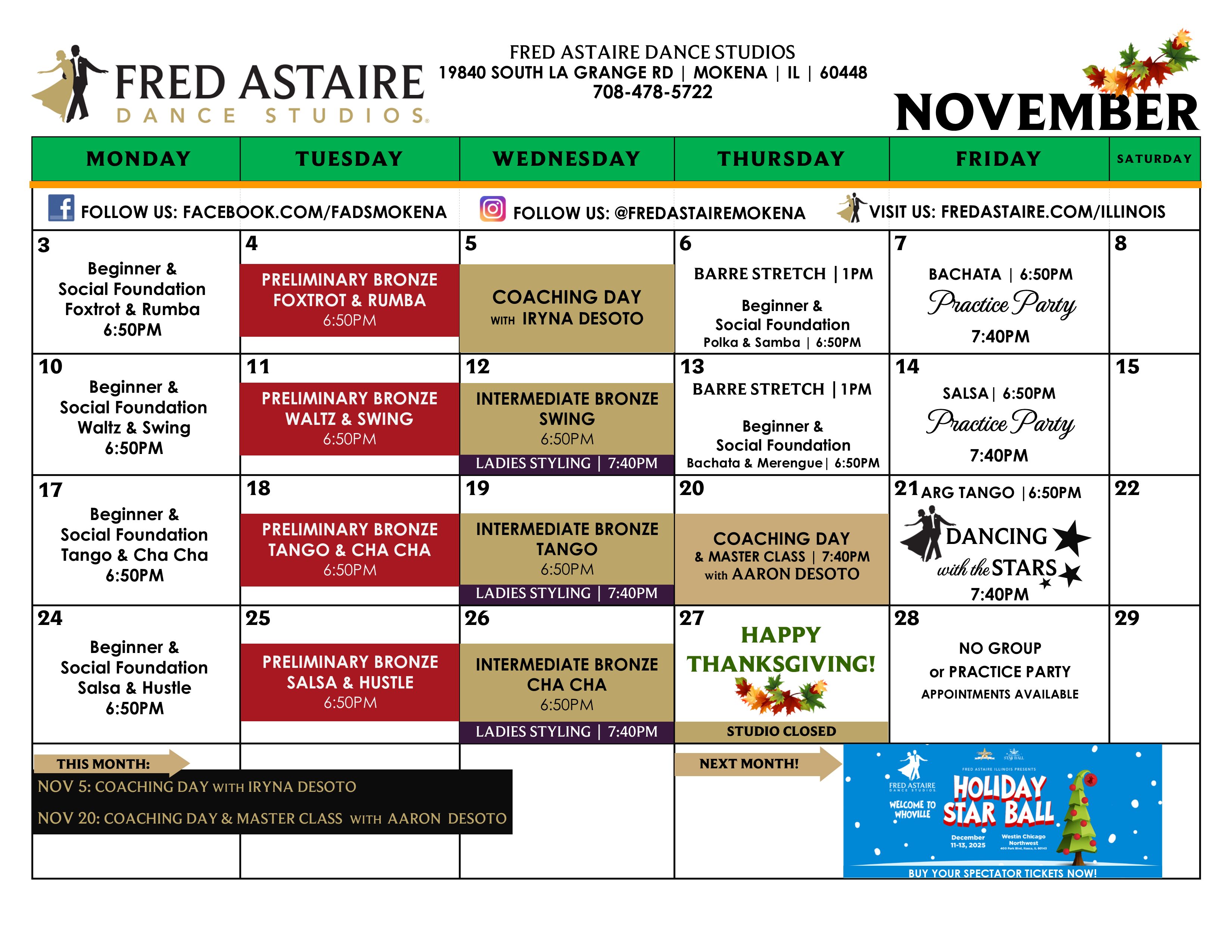 Check out this month’s schedule of Group Classes, Practice Parties and Special Events at our Studio. Come with a dance partner or by yourself. For more information and to join us, just give us a call! 708-478-5722.