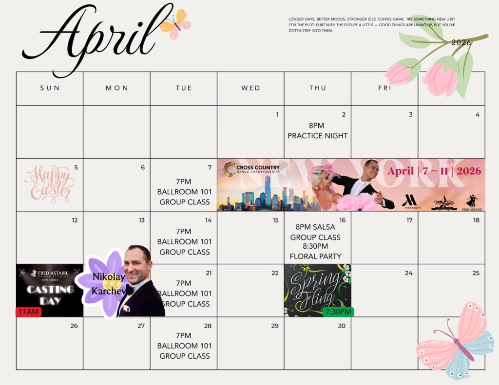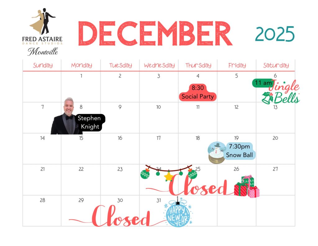 Check out this month’s schedule of Group Classes, Practice Parties and Special Events at our Studio. Come with a dance partner or by yourself. For more information and to join us, just give us a call!