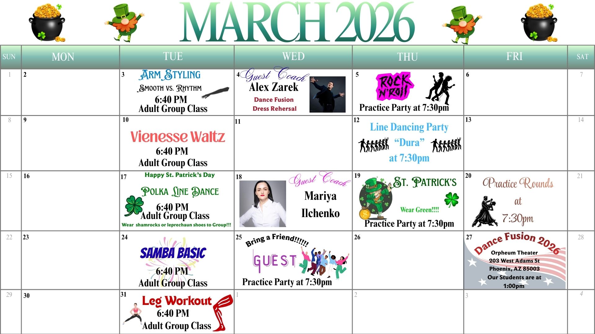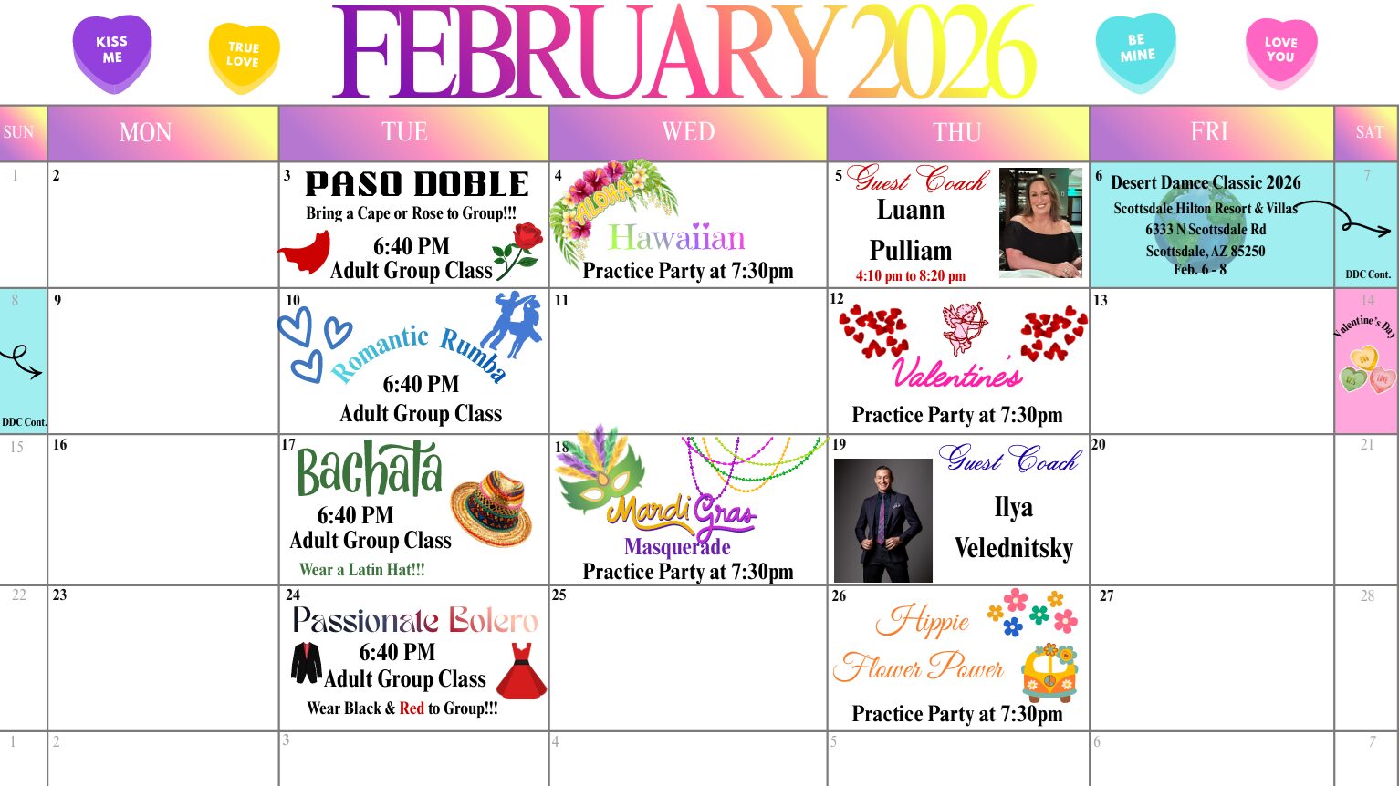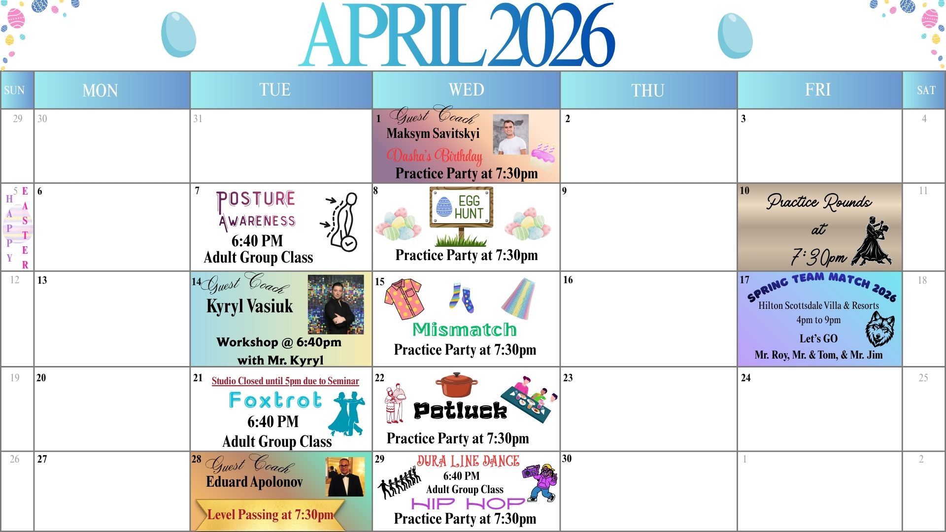 Below you will find a monthly calendar of events, group classes, practices parties and more at our Moon Valley dance studio!