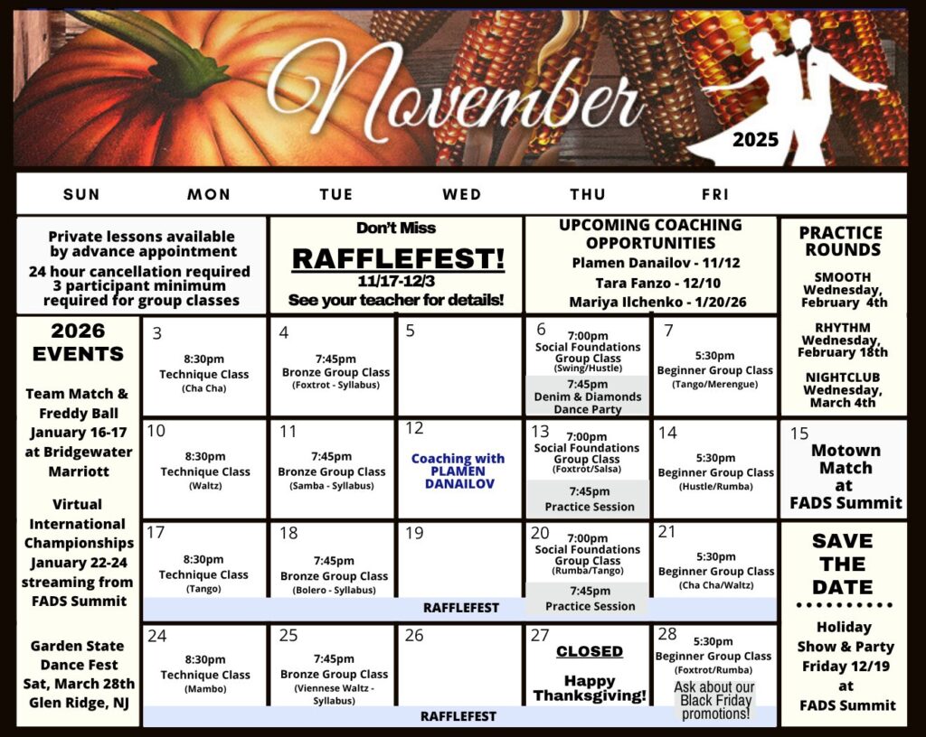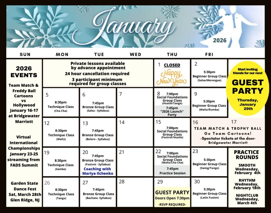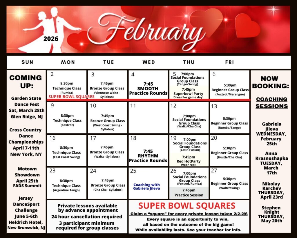 Check out this month’s schedule of Group Classes, Practice Parties and Special Events at our Studio. Come with a dance partner or by yourself. For more information and to join us, just give us a call!