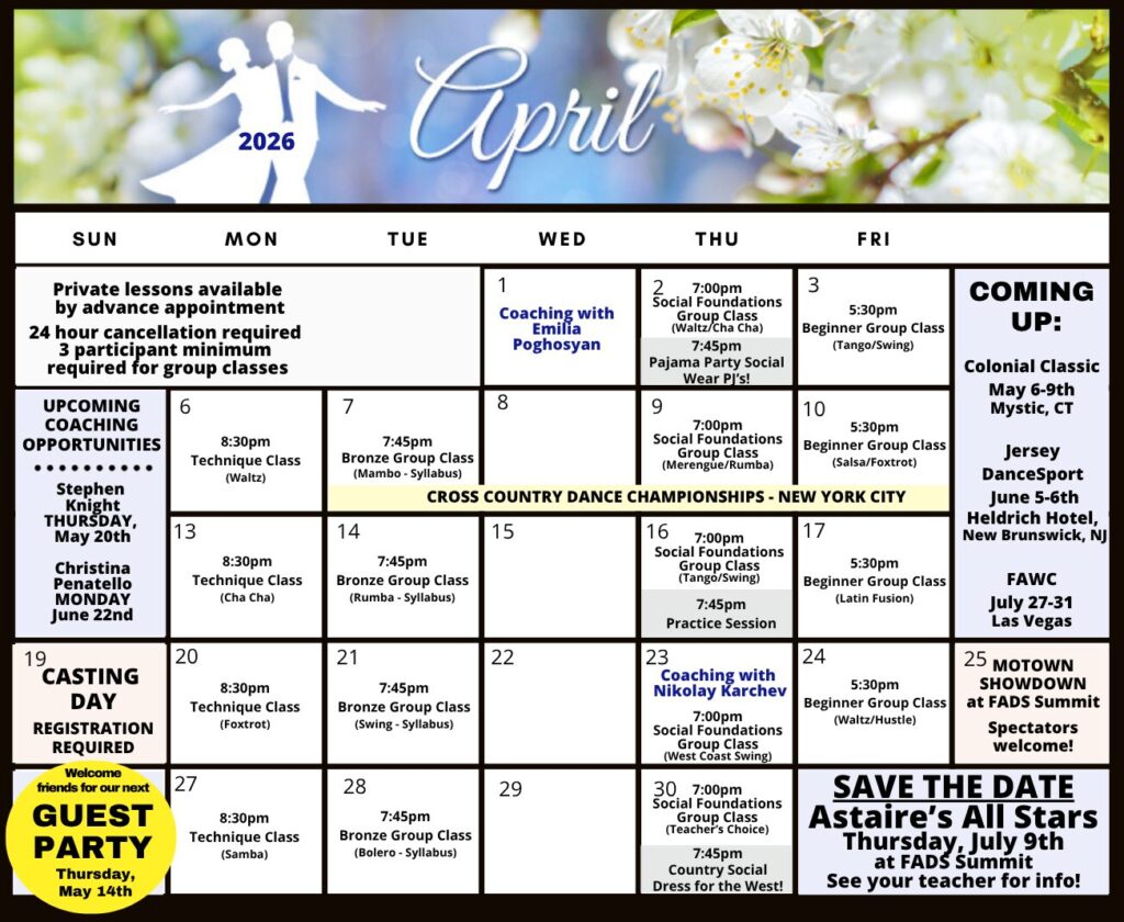 Check out this month’s schedule of Group Classes, Practice Parties and Special Events at our Studio. Come with a dance partner or by yourself. For more information and to join us, just give us a call!