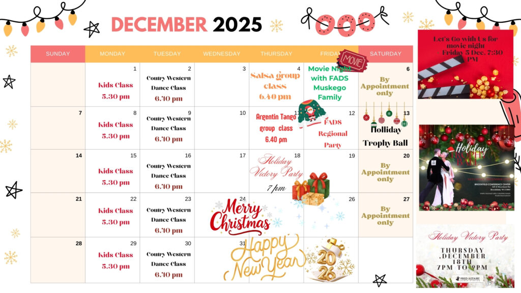 Check out this month’s schedule of Group Classes, Practice Parties and Special Events at our studio. Come with a dance partner or by yourself. For more information and to join us, just give us a call at 262-710-4055 or send us an email [email protected]!
