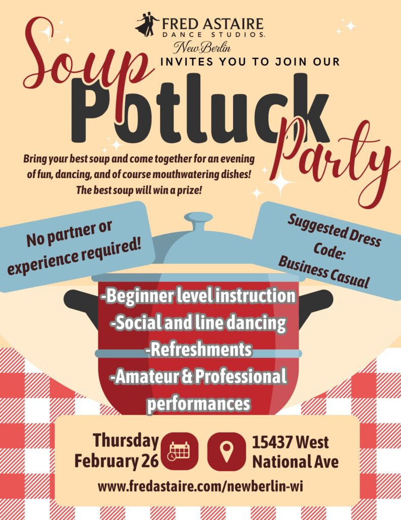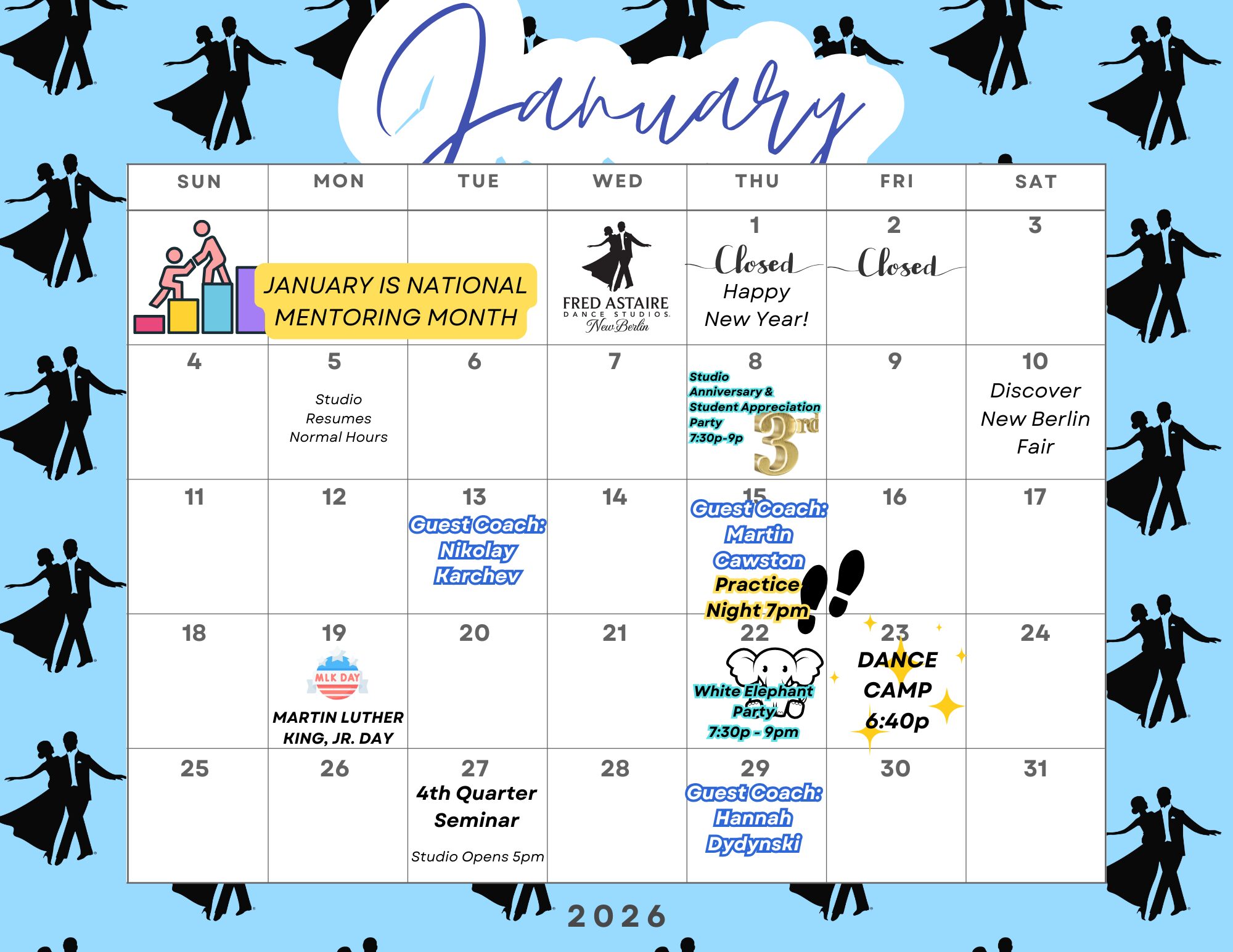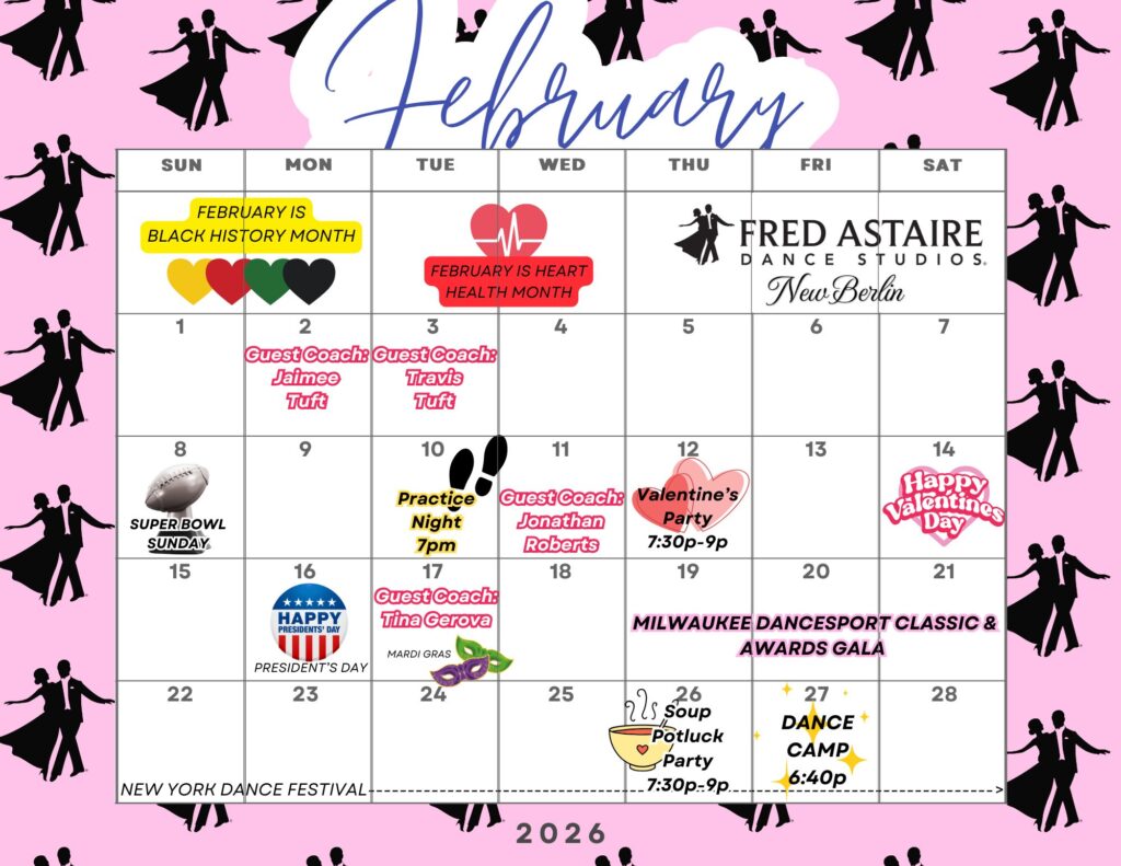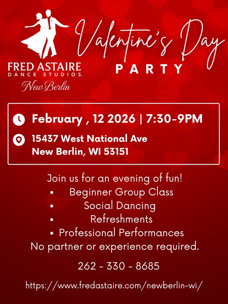 Join the New Berlin studio for an evening of social dancing! Our social practice parties are a fun-filled night that includes beginner level instruction, social dancing, line dances, snacks, refreshments, and amateur & professional performances.