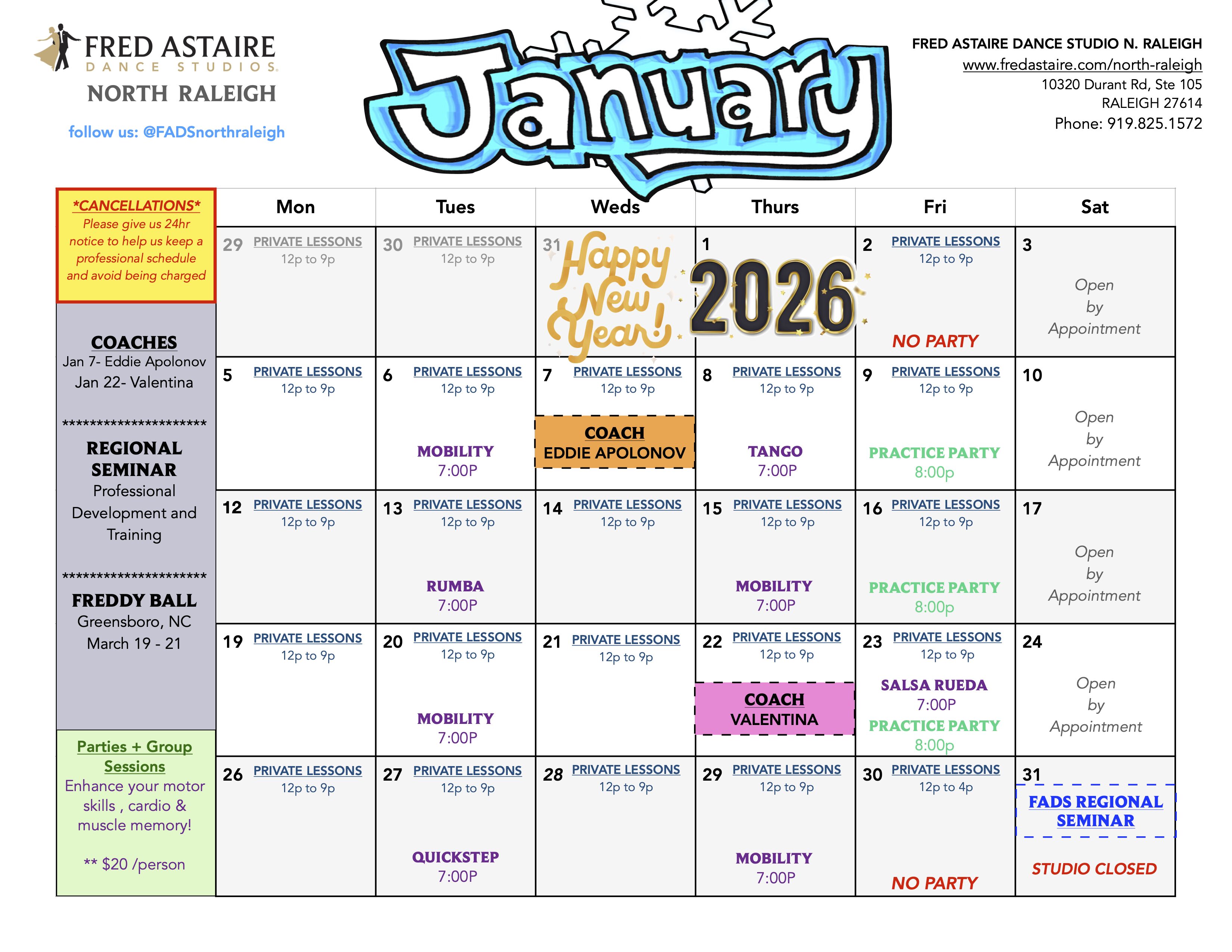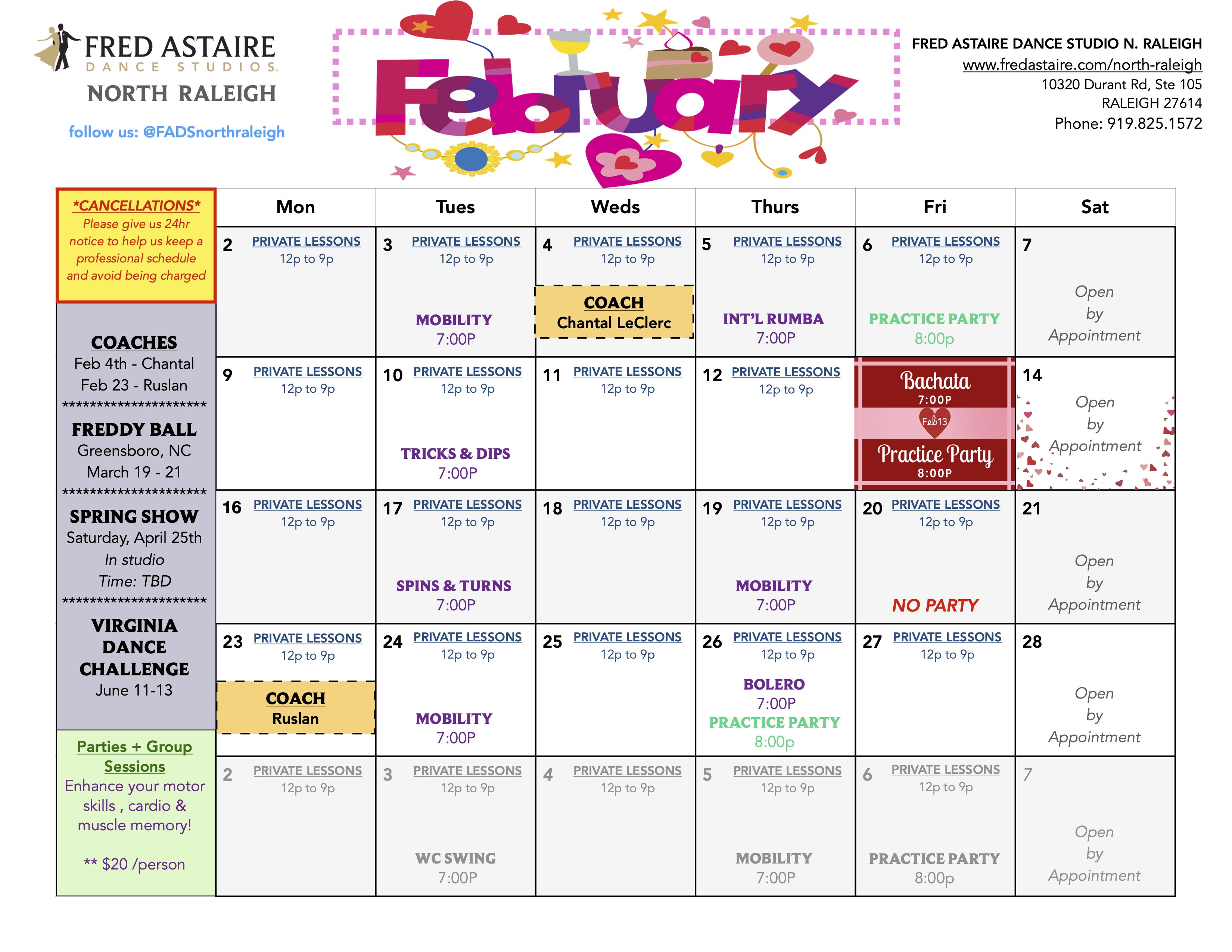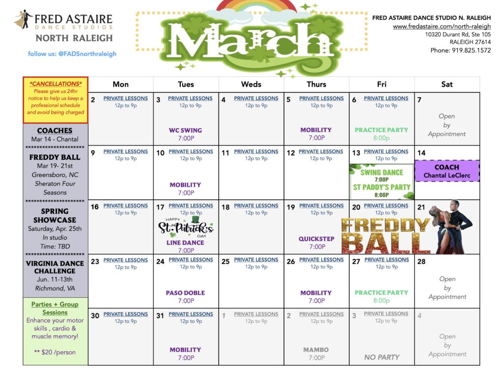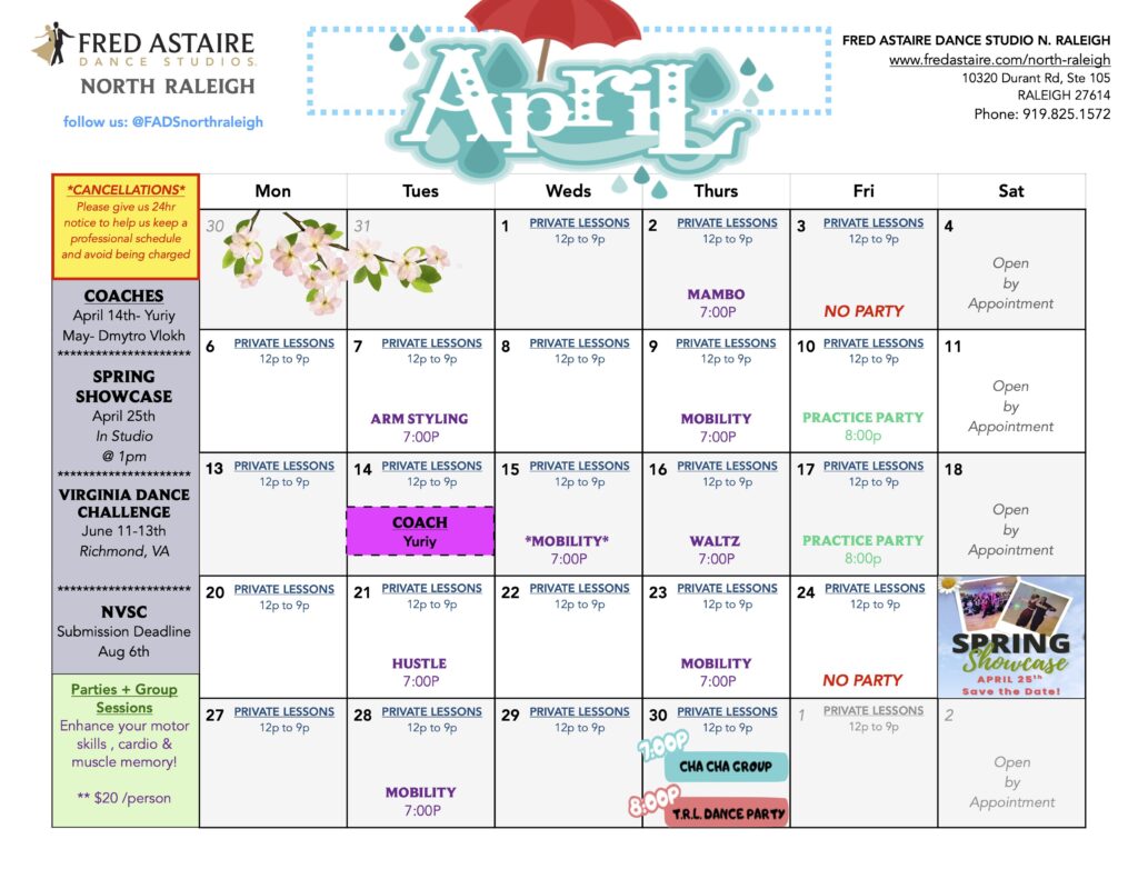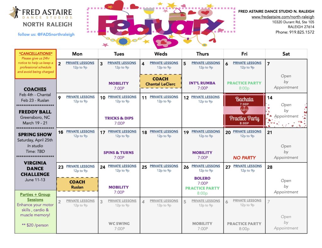 Check out this month’s schedule of Group Dance Classes, Dance Practice Parties and Special Events at Fred Astaire North Raleigh.