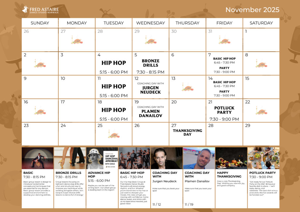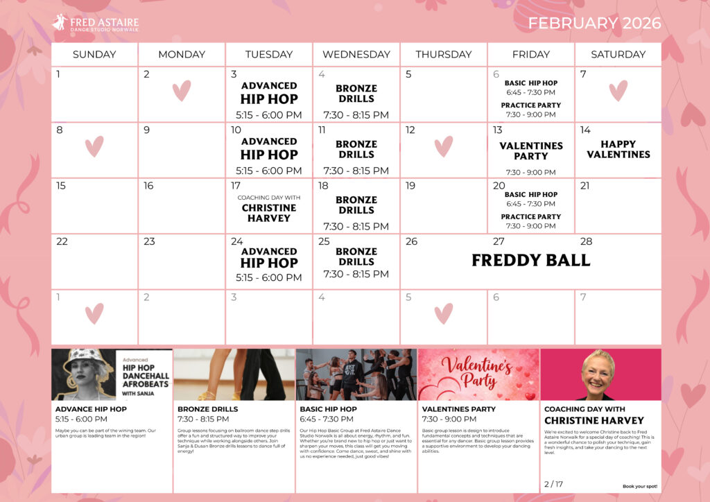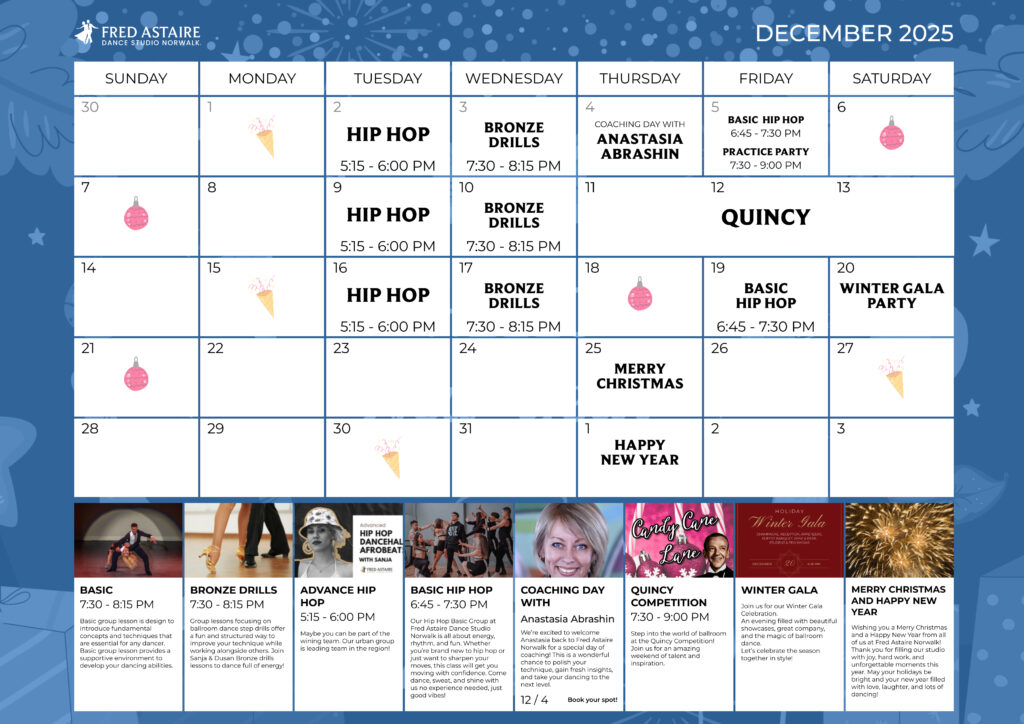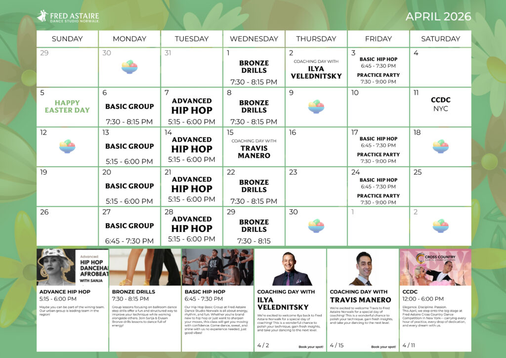At Fred Astaire Dance Studios of Norwalk, we teach 3 types of lessons. Private, which are one on one with your instructor, Group as seen below on the Calendar and Practice Parties. All 3 are included with your first enrolled program.