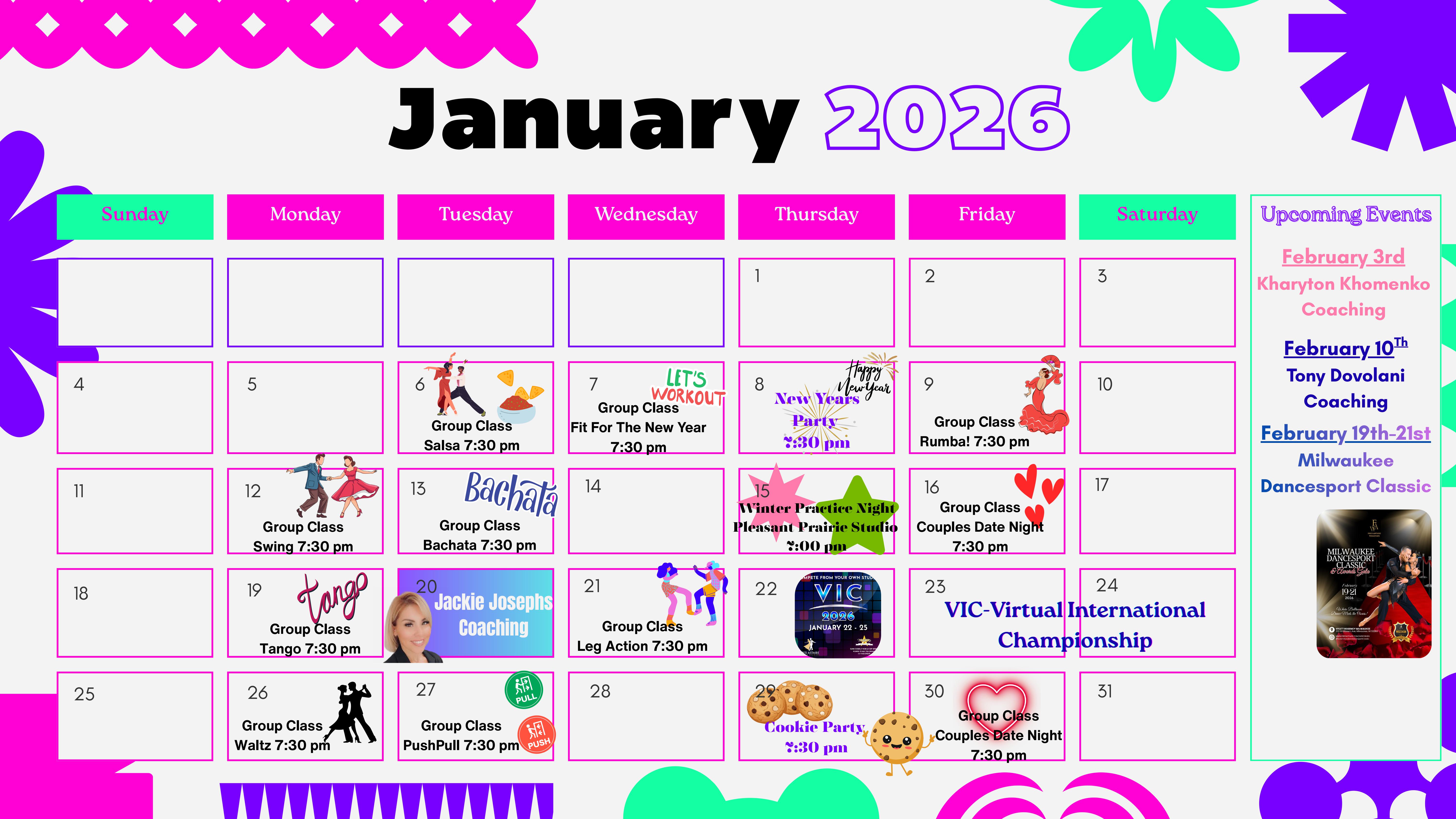 Stay tuned to check out our monthly schedule of Group Classes, Practice Parties and Special Events at our Studio. Come with a dance partner or by yourself. For more information and to join us, just give us a call at 414-304-8999 or email at [email protected].