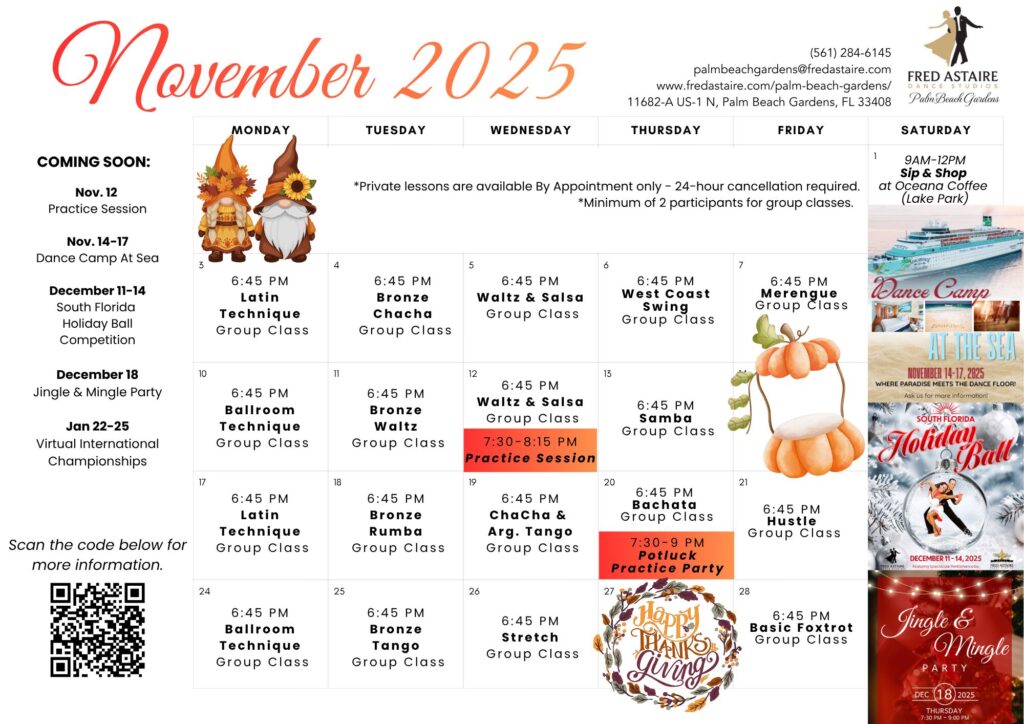 Check out this month’s schedule of Group classes, Practice Parties, and Special Events at our Studio! Come with a dance partner or by yourself. For more information and to join us, give us a call at (561) 284-6145 or send us an email at [email protected]!