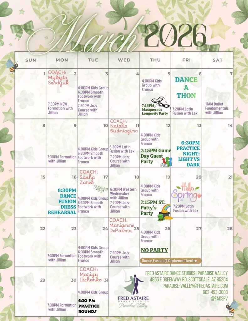 Below you will find our monthly calendar of events for Fred Astaire Dance Studio of Paradise Valley, including group classes, practice parties, and special events!