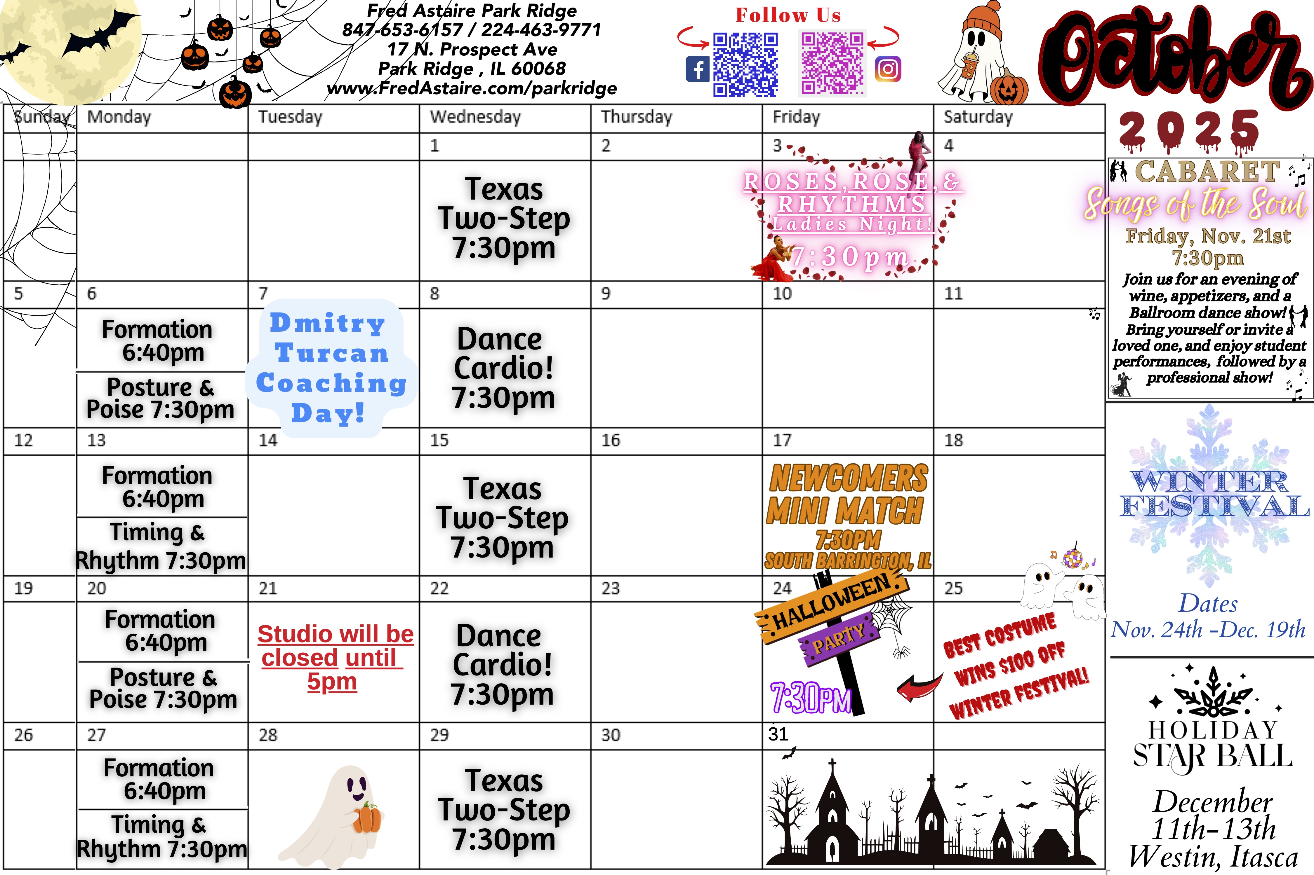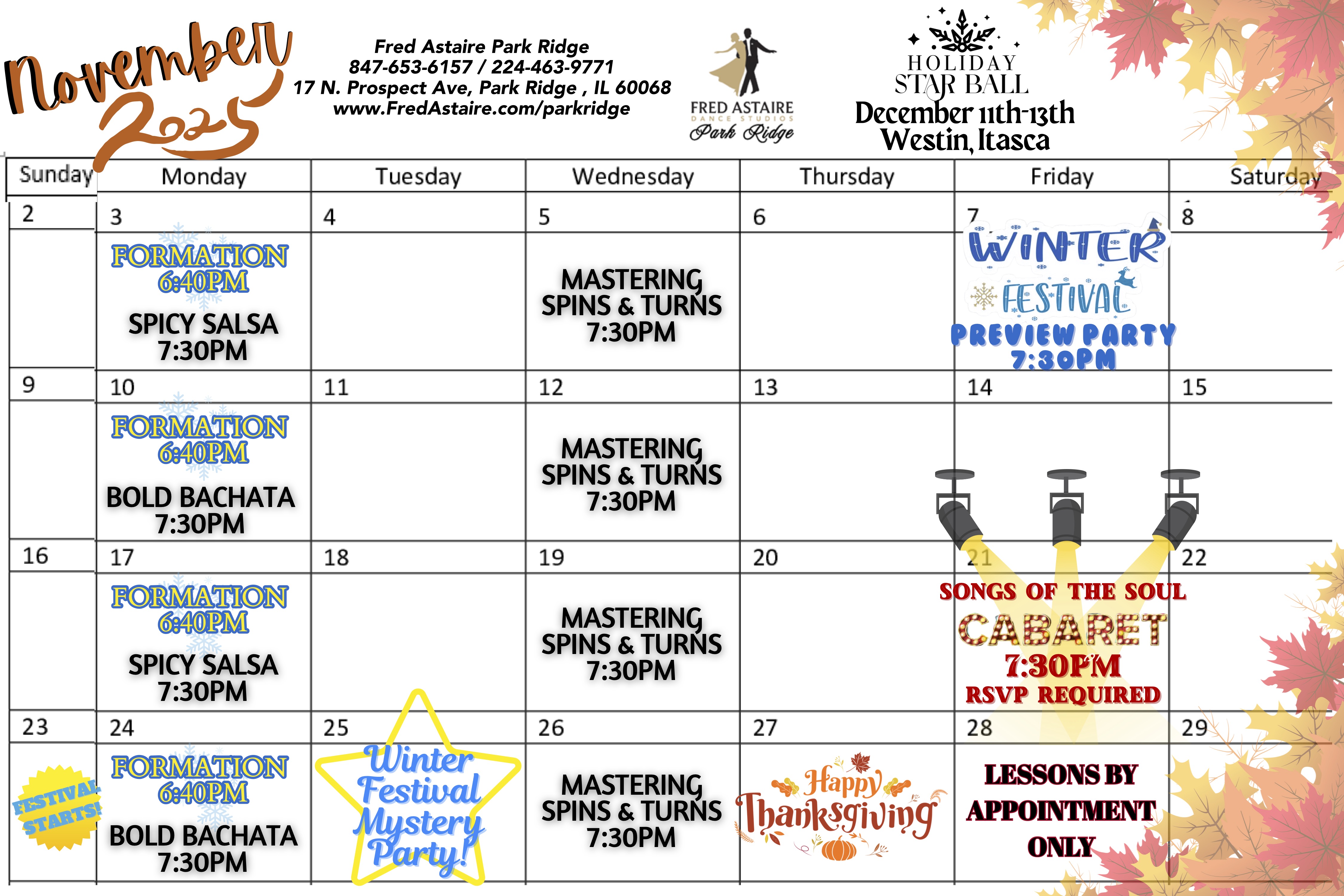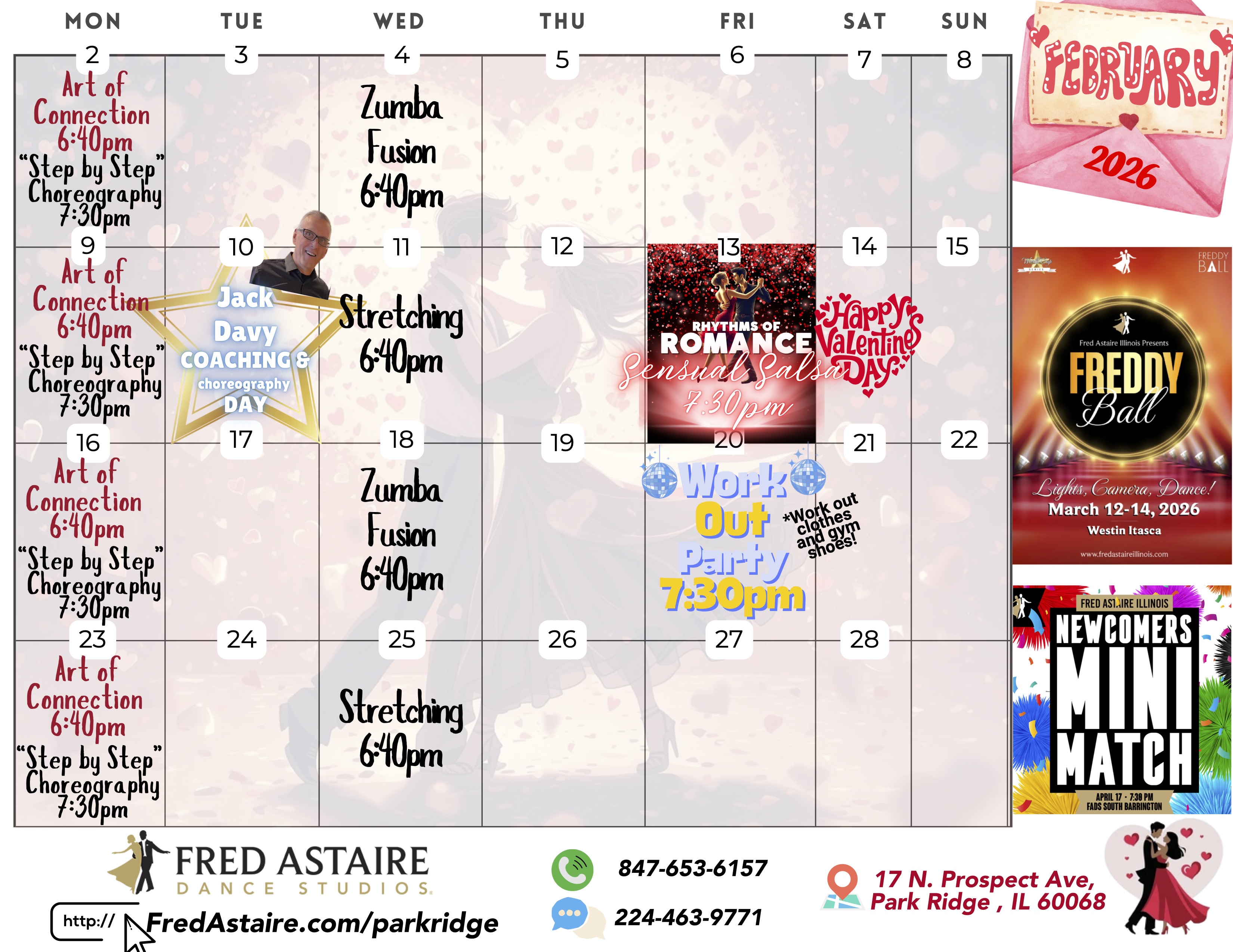 Check out this month’s schedule of Group Classes, Practice Parties and Special Events at our Studio. Come with a dance partner or by yourself. For more information and to join us, just give us a call 847-653-6157 or text 224-463-9771 .