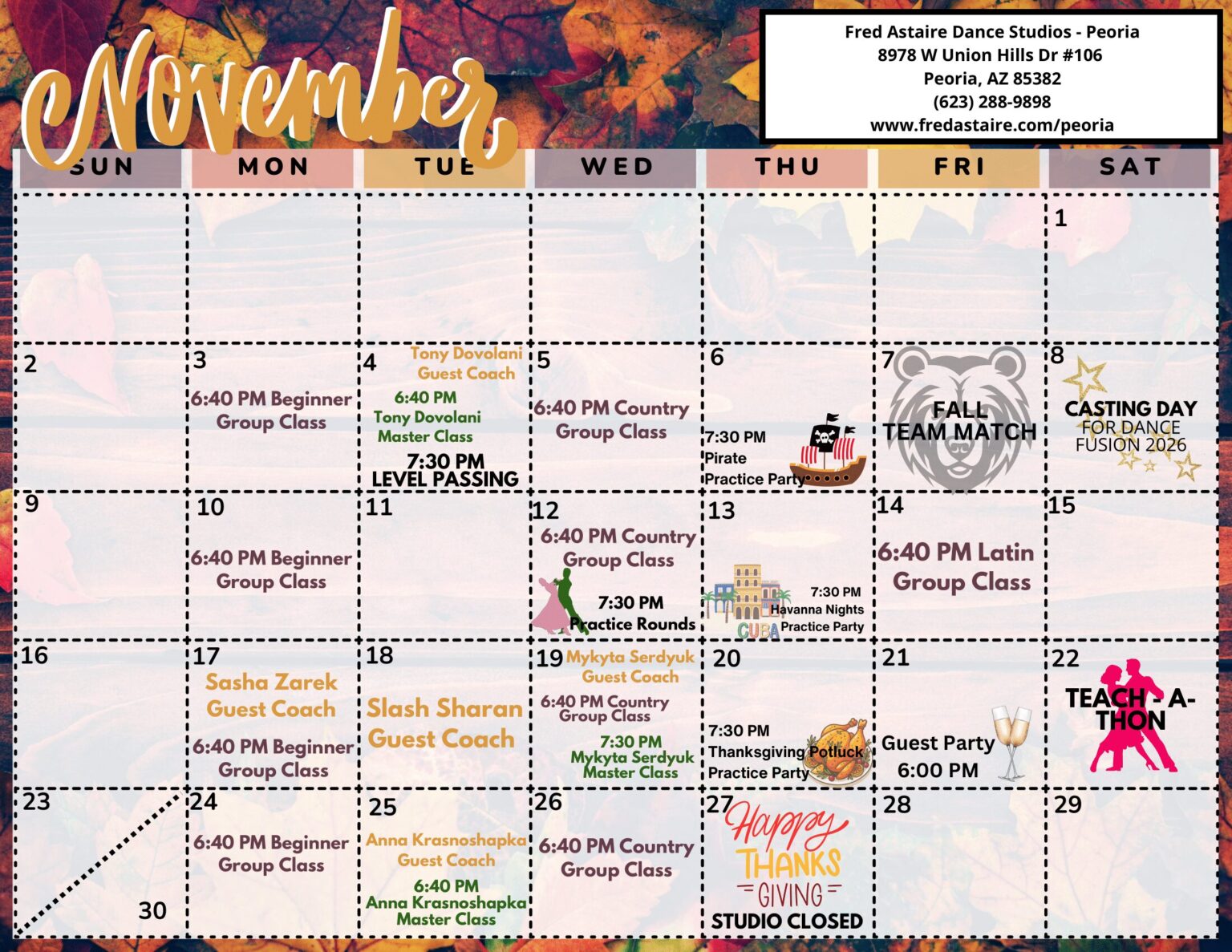 Check out this month’s schedule of Group Classes, Practice Parties and Special Events at our Studio. Come with a dance partner or by yourself. For more information and to join us, just give us a call!