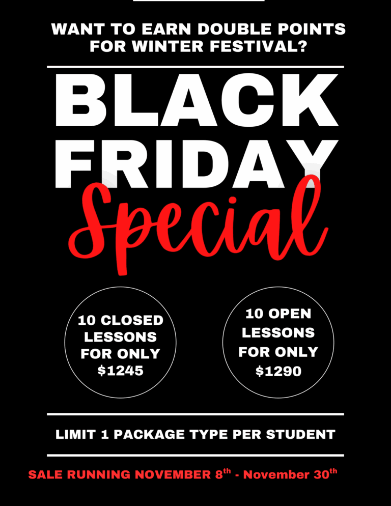For a limited time only, enjoy our amazing Black Friday bundles! Get your next bundle of lessons for this amazing low price using the buttons below to purchase now, or contact the studio to redeem over the phone or if you have any other questions!