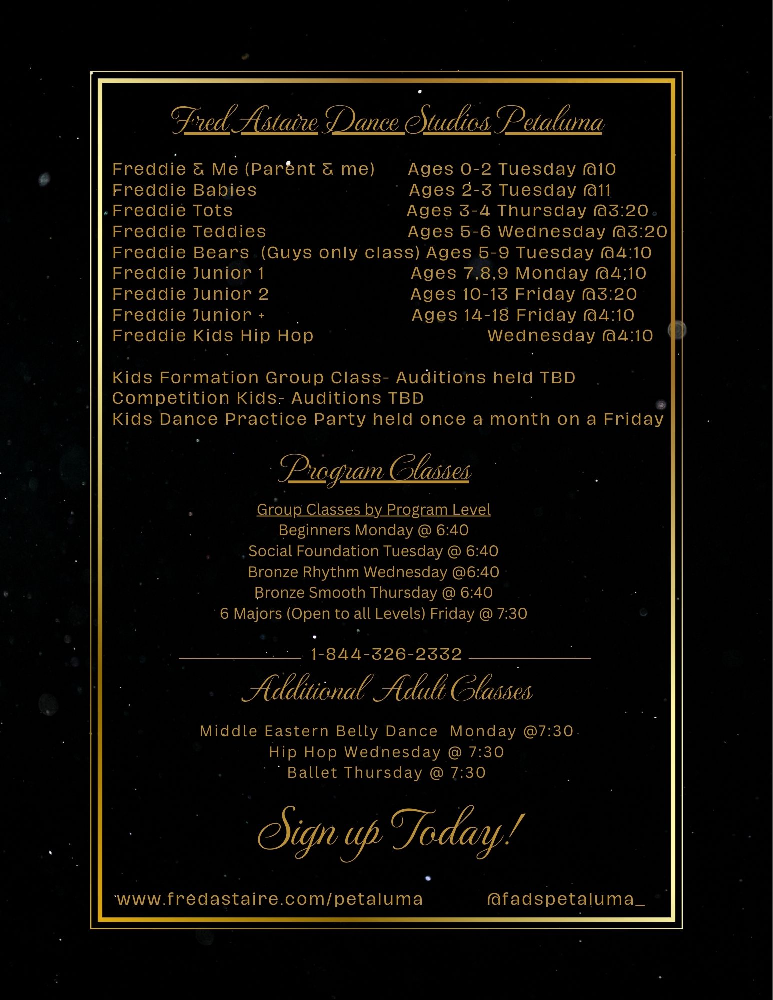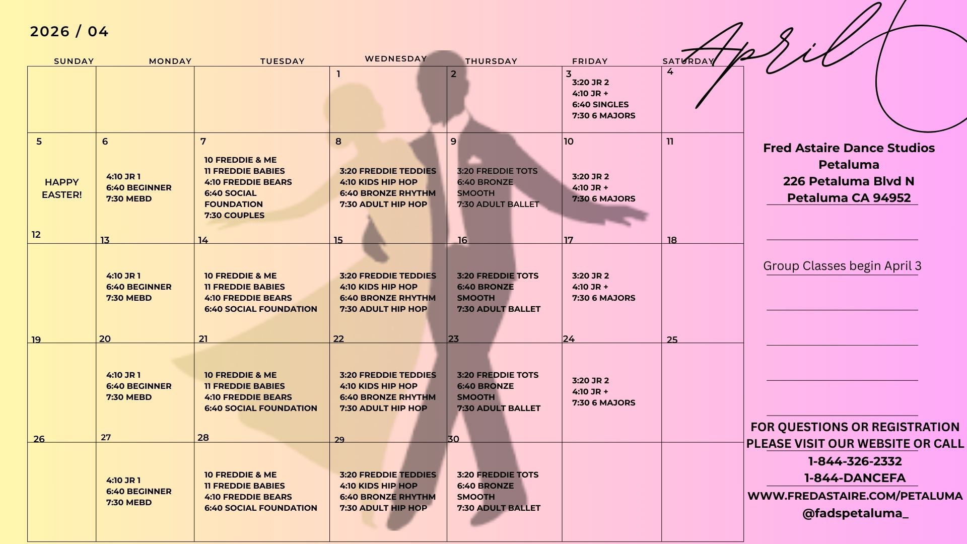 Below you will find our monthly calendar of events for Fred Astaire Dance Studio of Petaluma, including group classes, practice parties, and special events!