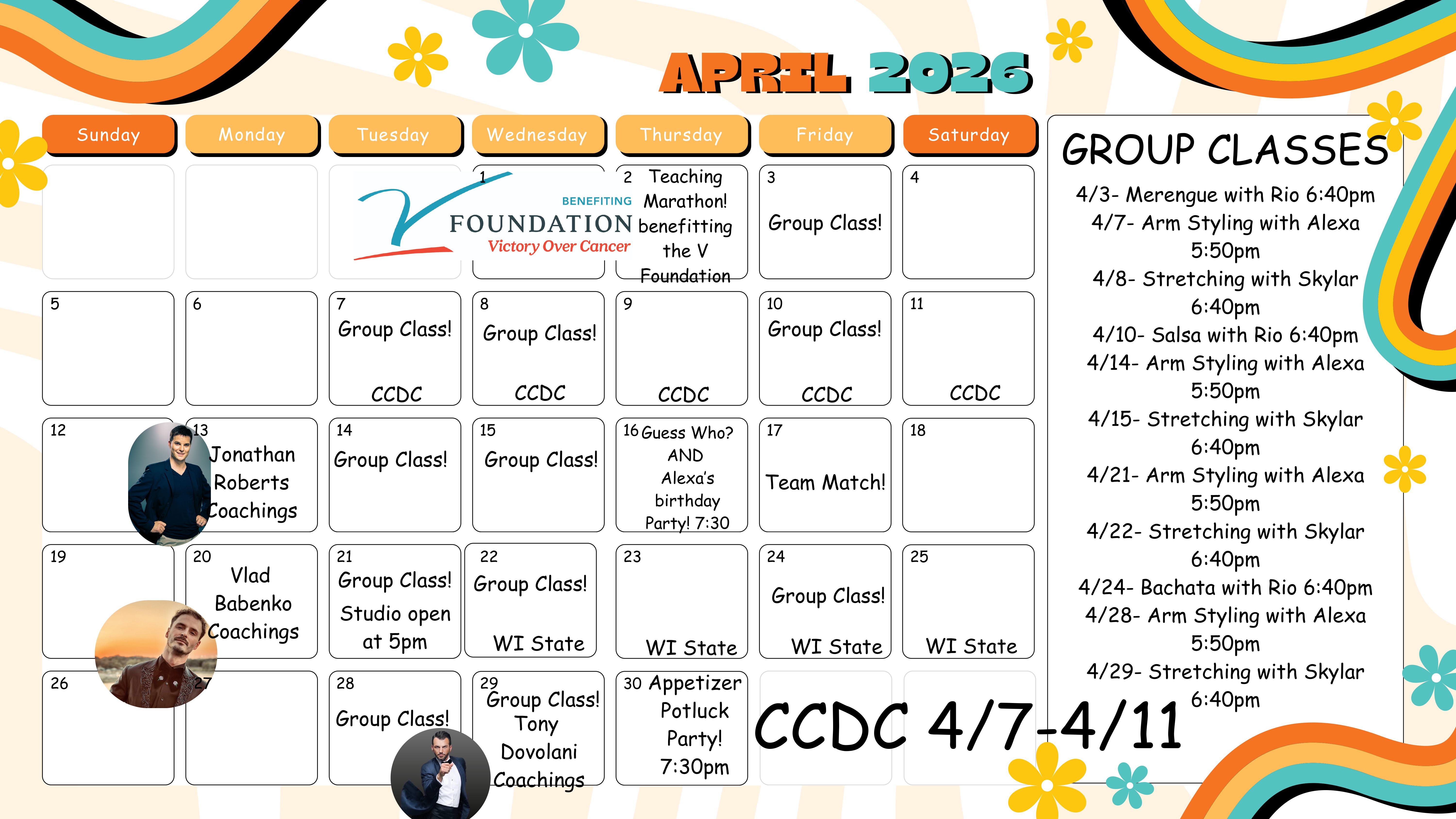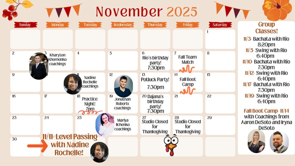 Check out this month’s schedule of Group Classes, Practice Parties, and Special Events at our Studio. Come with a dance partner or by yourself. For more information and to join us, just give us a call at 262-577-5859 or send us an email [email protected]!