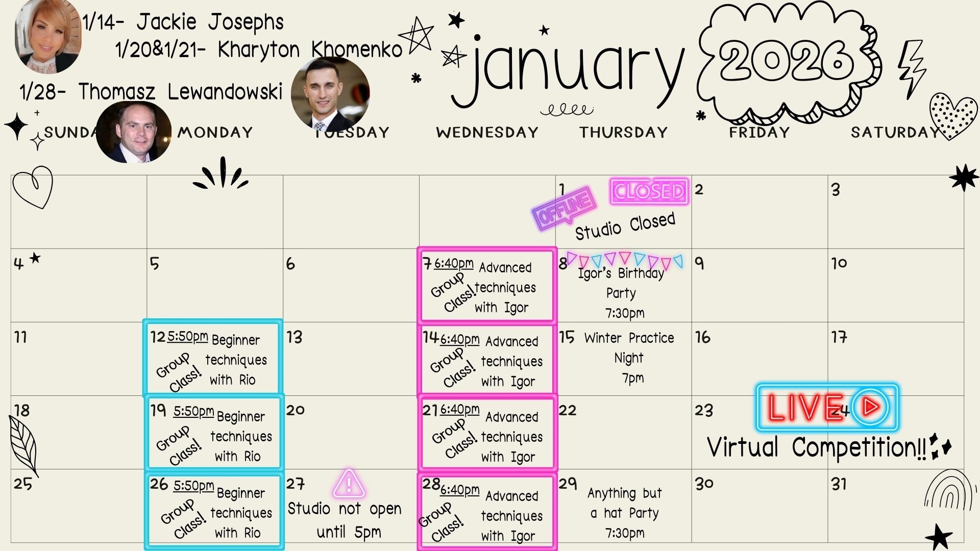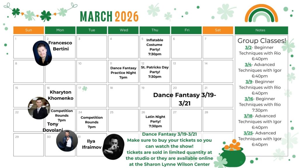 PLEASE NOTE: Our calendar of events is subject to change. Be sure to contact our studio with questions and for more information.