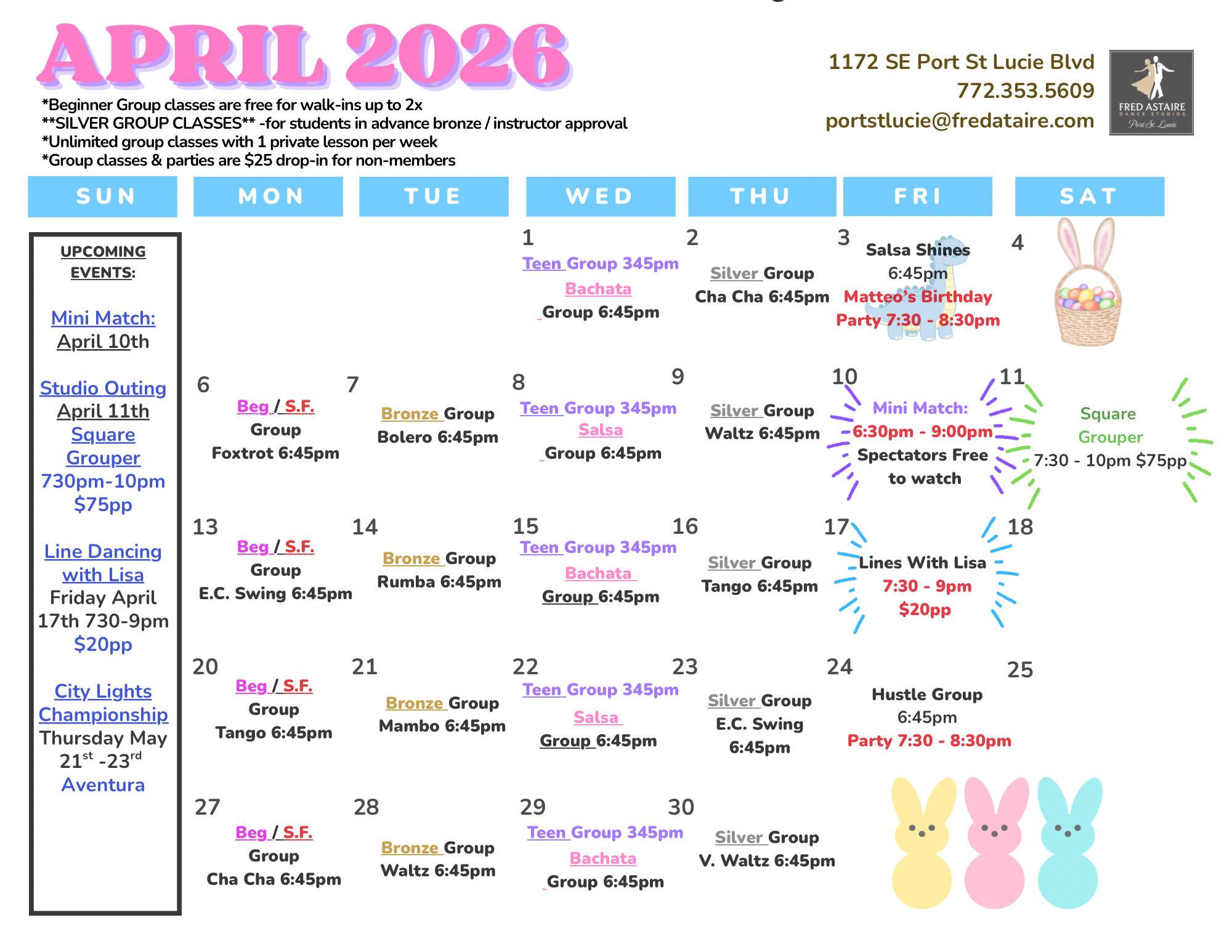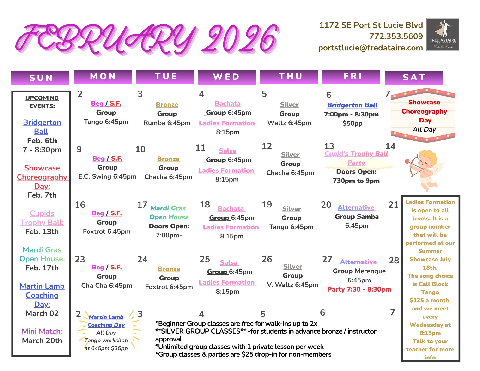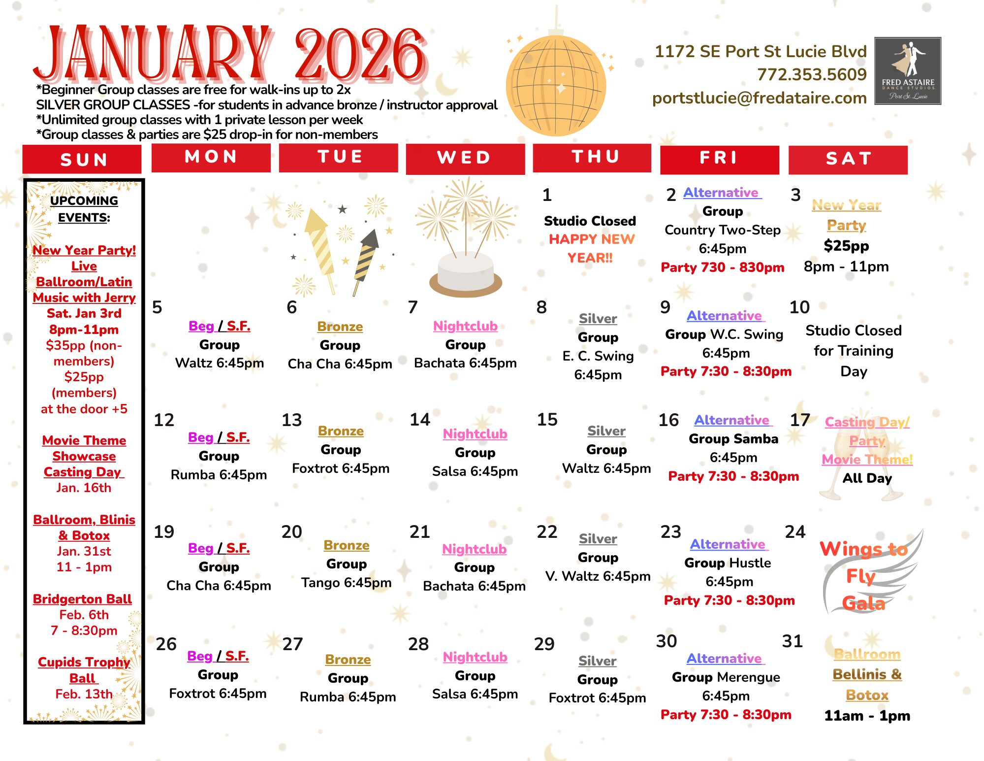 Check out this month’s calendar for the group class and practice party schedule and upcoming events. Please check with your instructor for the appropriate group classes for your program.