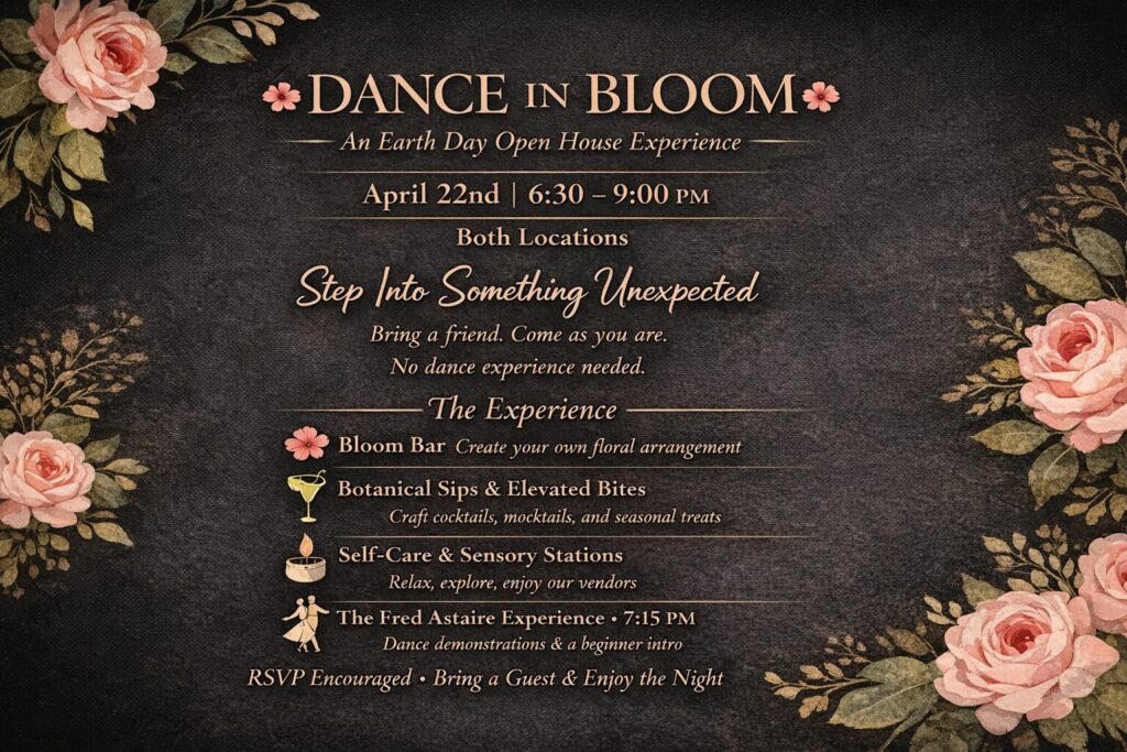 Join us on Wednesday, April 22nd for our “Dance in Bloom” Earth Day Open House! This after work open house event is the perfect time to bring a friend or two that you want to introduce to the world of Ballroom Dance, and have tons of fun together all evening long!