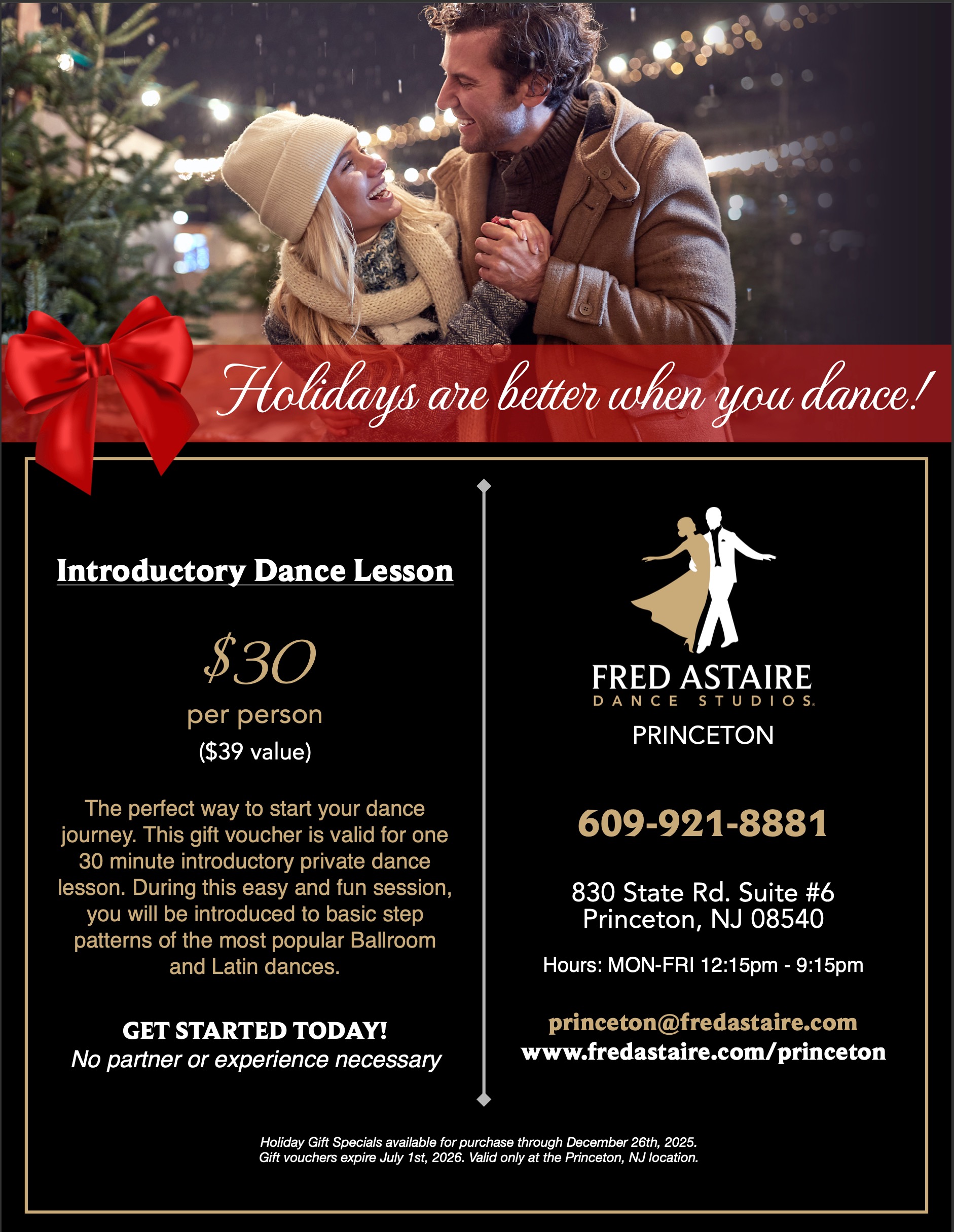 The perfect way to start your dance journey. This gift voucher is valid for one 30 minute introductory private dance lesson. During this easy and fun session, you will be introduced to basic step patterns of the most popular Ballroom and Latin dances.