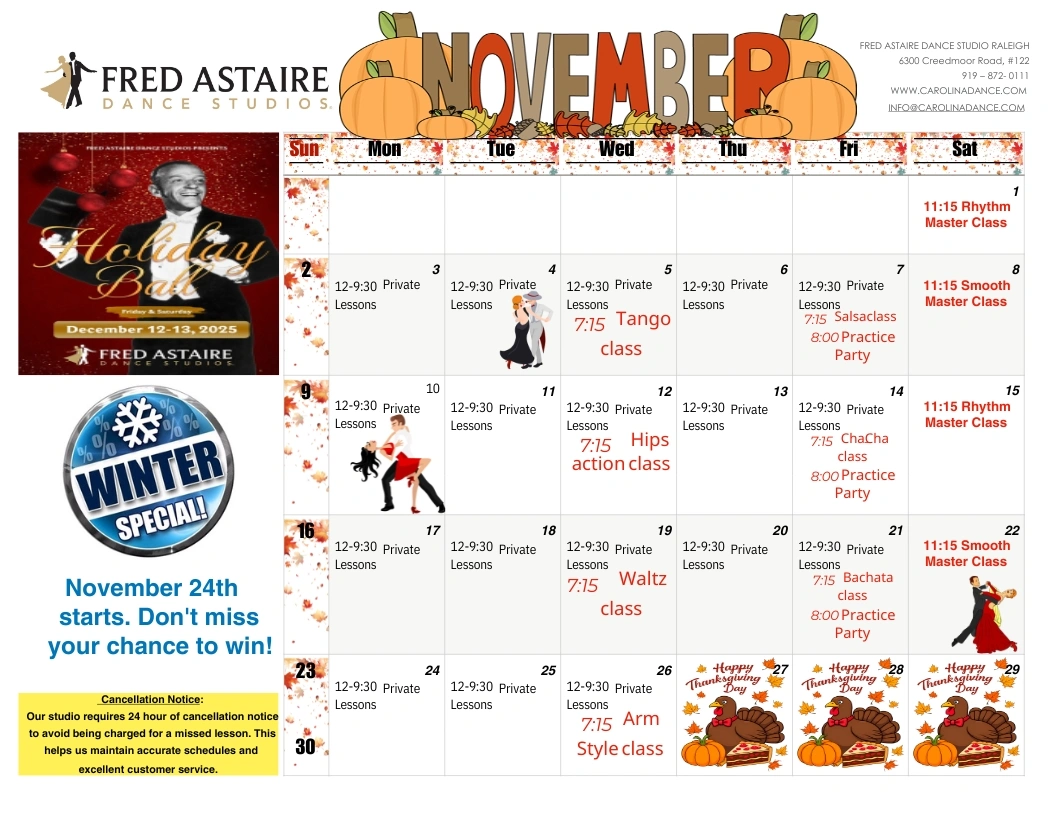 Check out this month’s schedule of Group Classes, Practice Parties and Special Events at our Raleigh Dance Studio. Come with a dance partner or by yourself—all dancers are matched with another solo dancer or with a instructor, ensuring thorough instructions and clear direction. For more information or to join us, just give us a call at 919-872-0111.