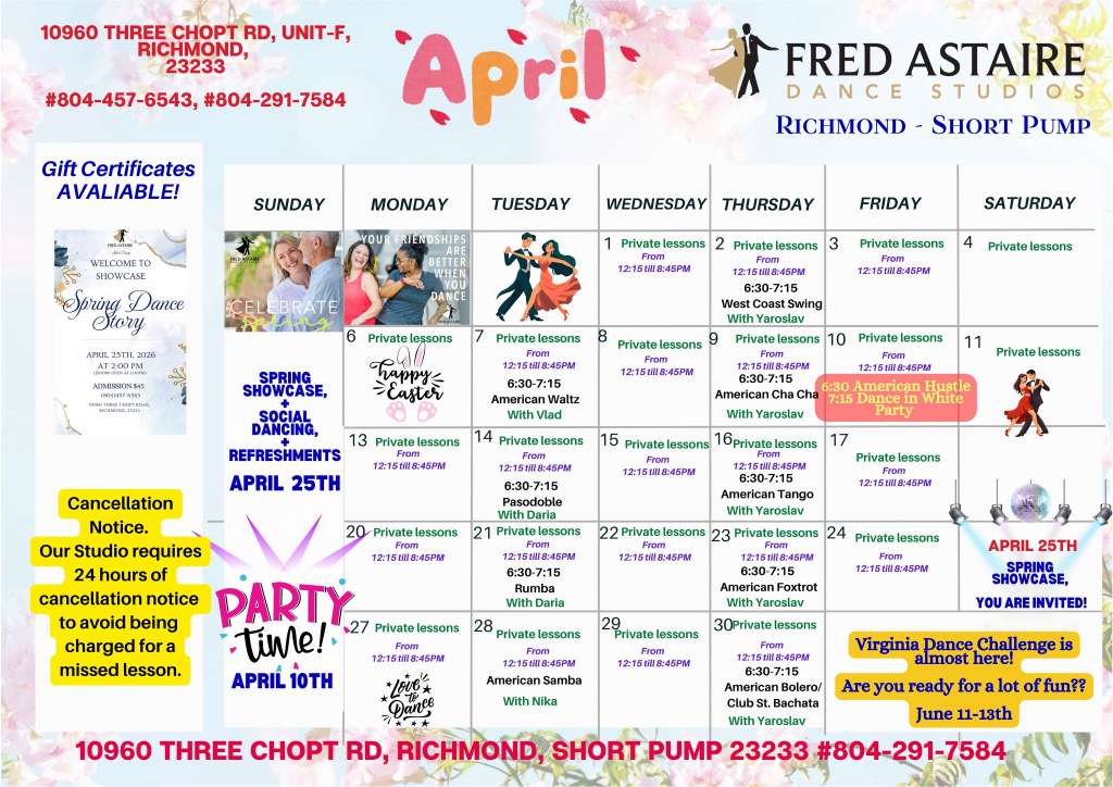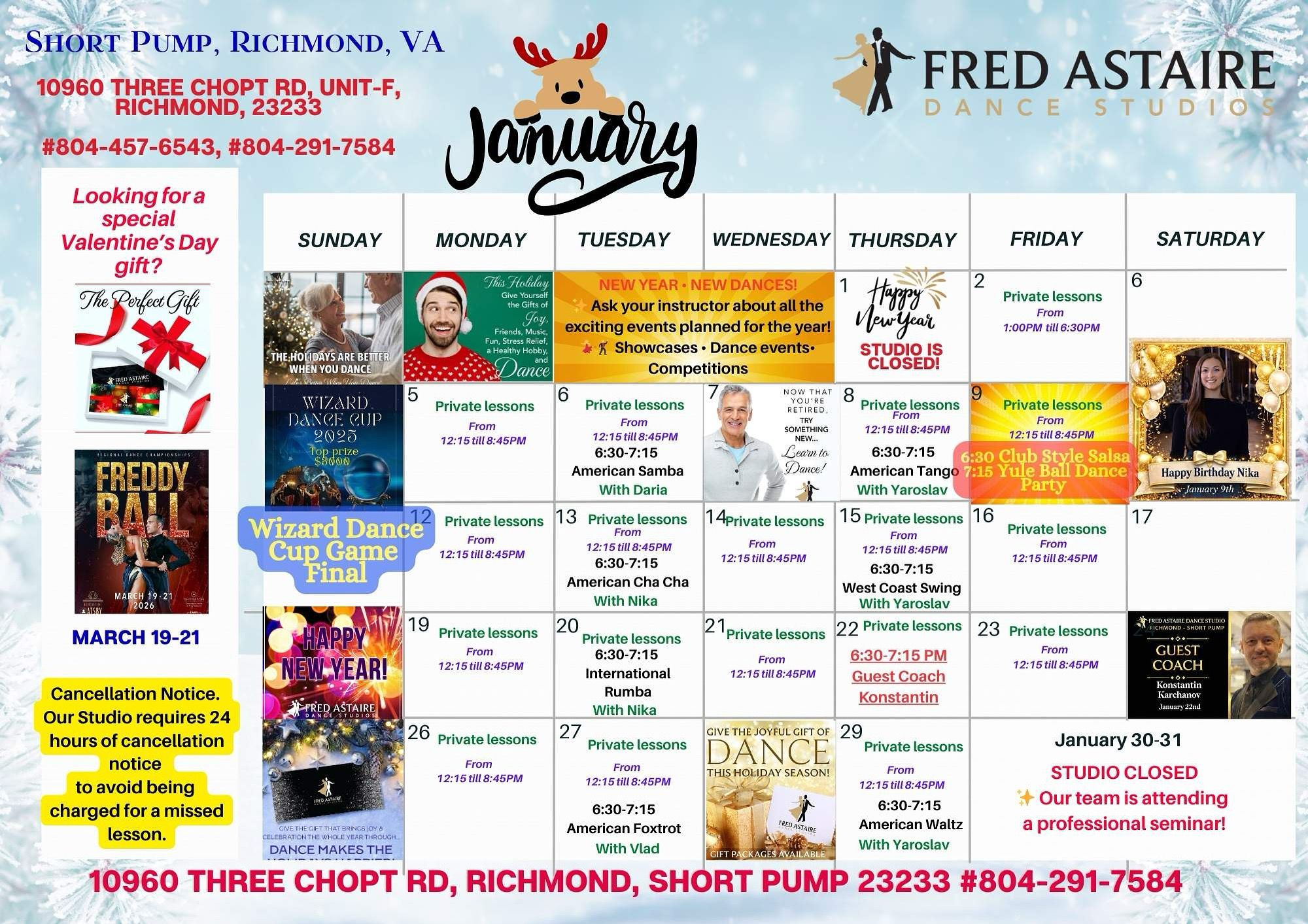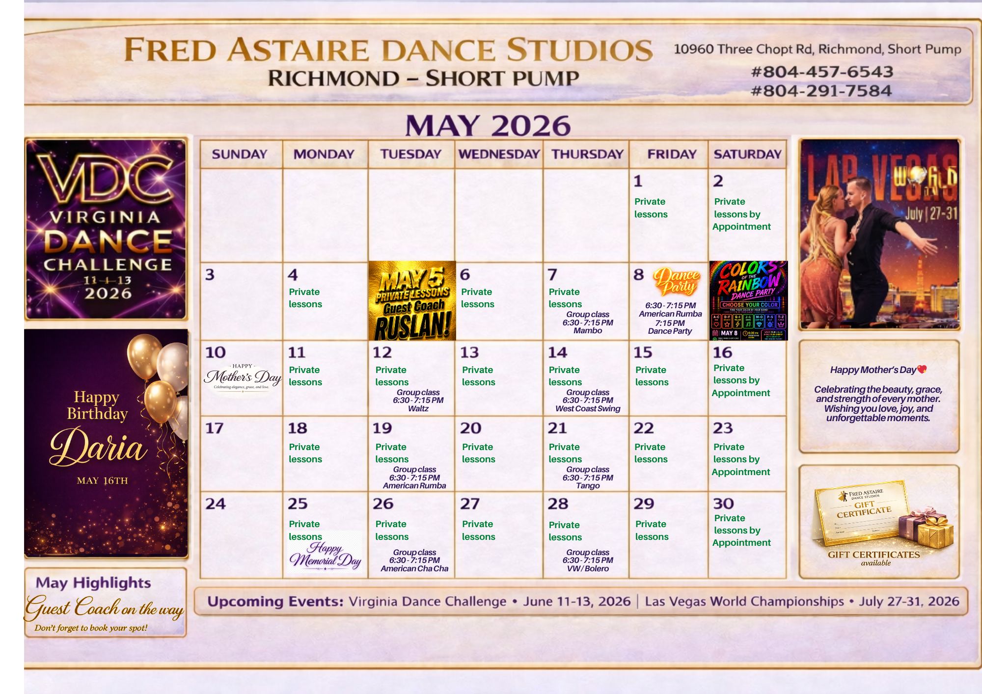 Below you will find our monthly calendar of events for Fred Astaire Dance Studio of Richmond Short Pump including group classes, practice parties, and special events!