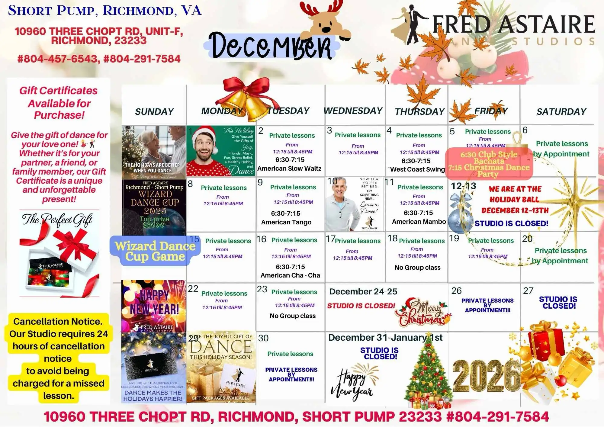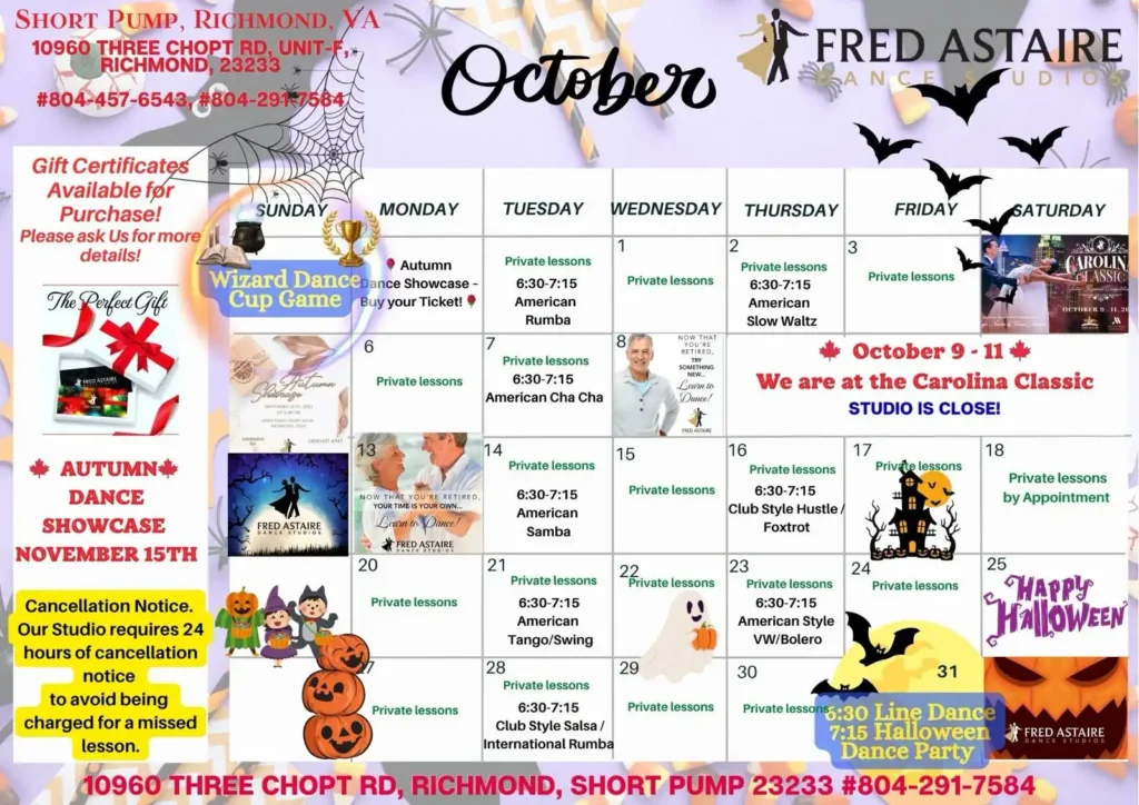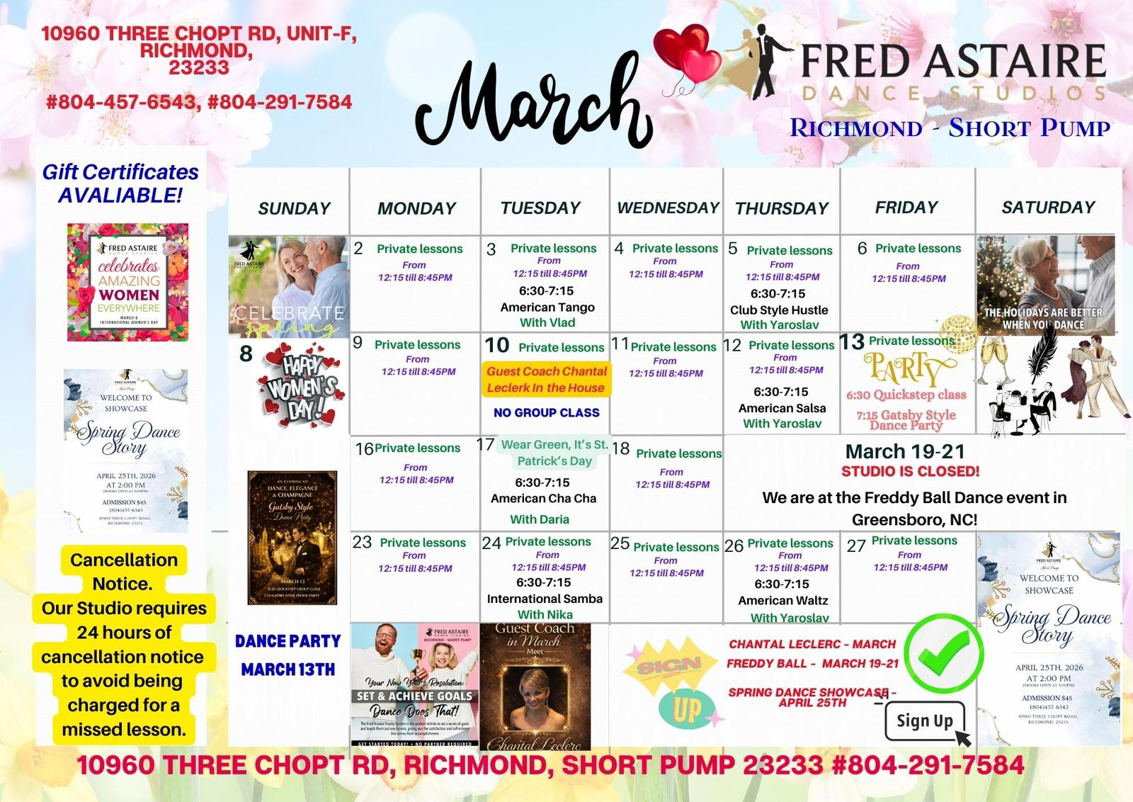 Below you will find our monthly calendar of events for Fred Astaire Dance Studio of Richmond Short Pump including group classes, practice parties, and special events!