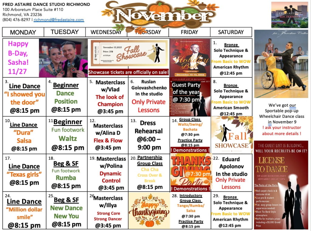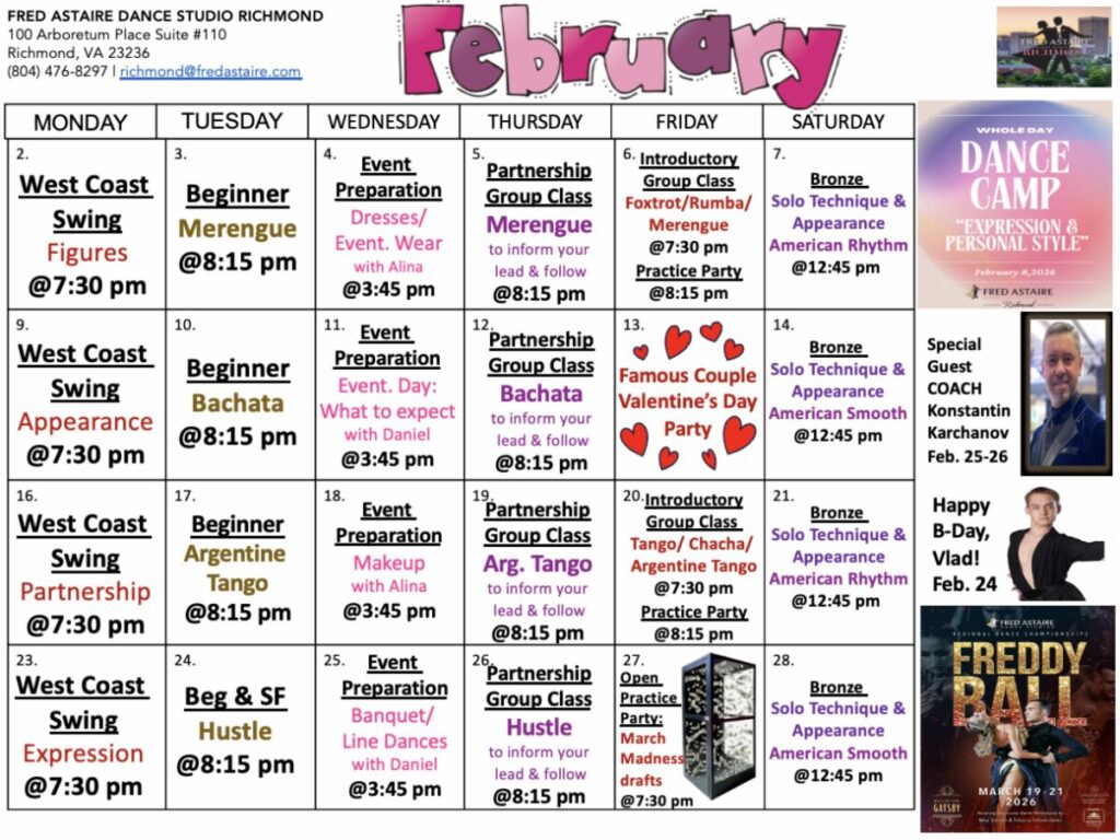 Check out this month’s schedule of Group Classes, Practice Parties and Special Events at our Studio. Come with a dance partner or by yourself. For more information and to join us, just give us a call!