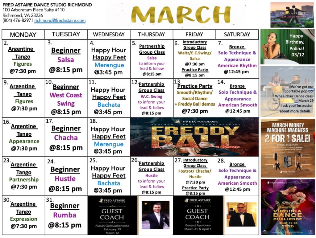 Check out this month’s schedule of Group Classes, Practice Parties and Special Events at our Studio. Come with a dance partner or by yourself. For more information and to join us, just give us a call!
