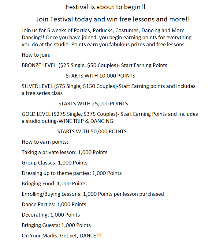 Festival Begins!! 5 weeks of themed parties, costumes, potlucks & dancing!! Begins Nov 19-Dec 17, themed parties on Wednesday evenings. Sponsor your teacher at a bronze, silver or gold level and start earning points for everything you do in the studio to win prizes and dance lessons. Begins November 19. Gold level sponsor will earn you the student wine trip outing. Date TBA