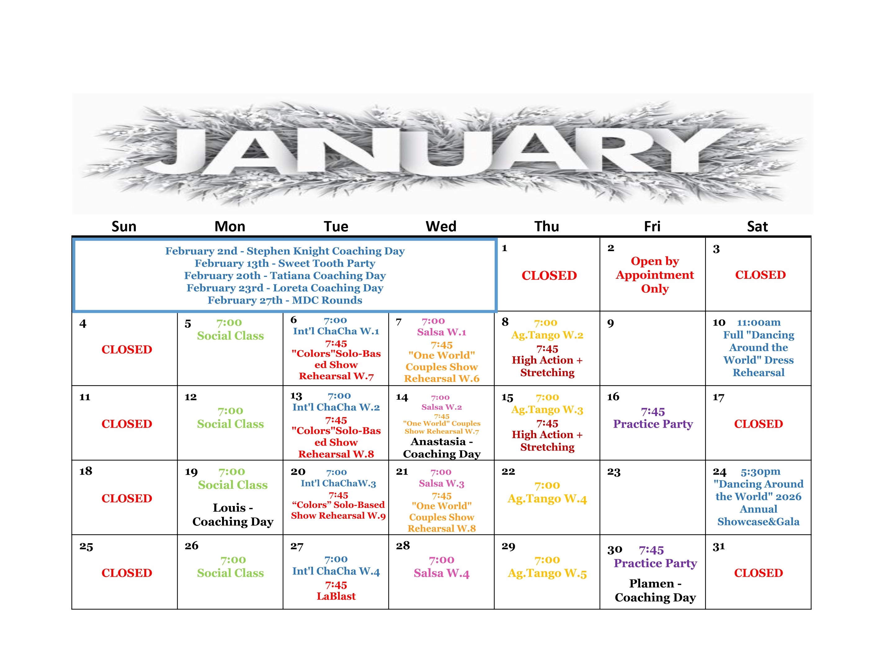 01/07/2026 – 01/21/2026 (Every Wednesday at 7:45 PM) – “One World” – Couples-Based Show Rehearsals for participants of “Dancing Around the World” 2026 Annual Showcase and Gala.