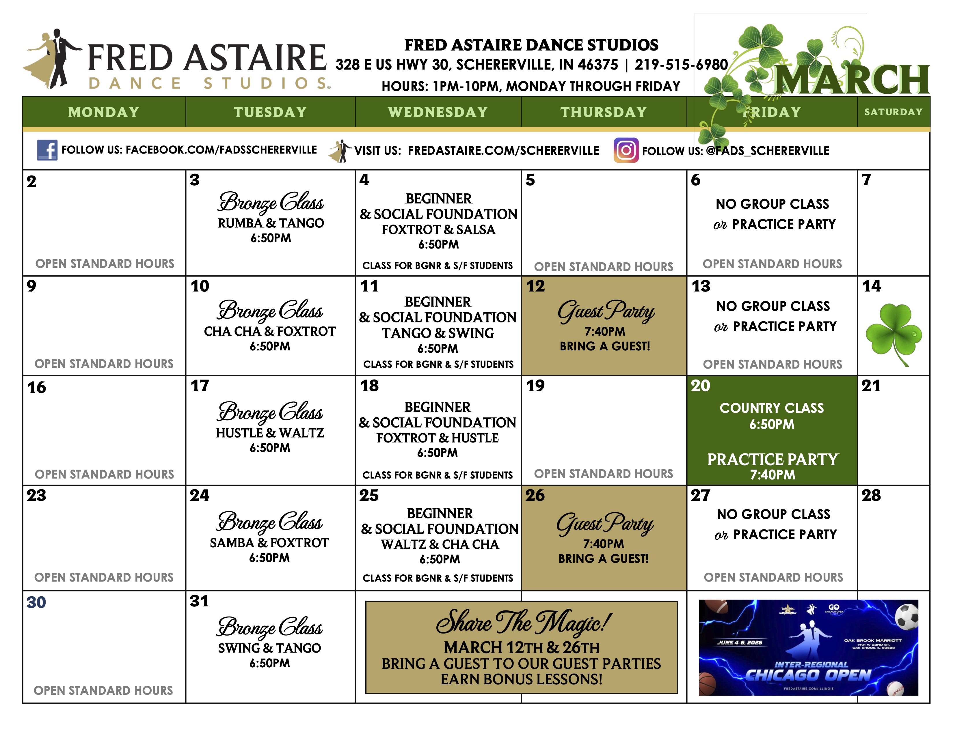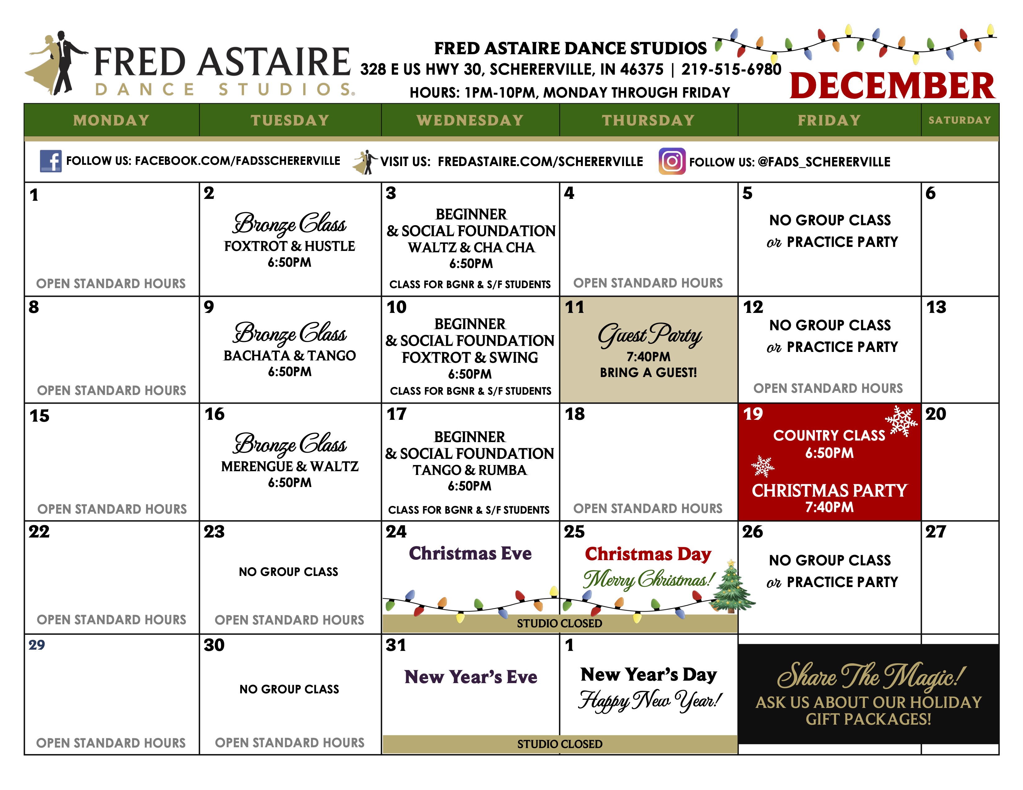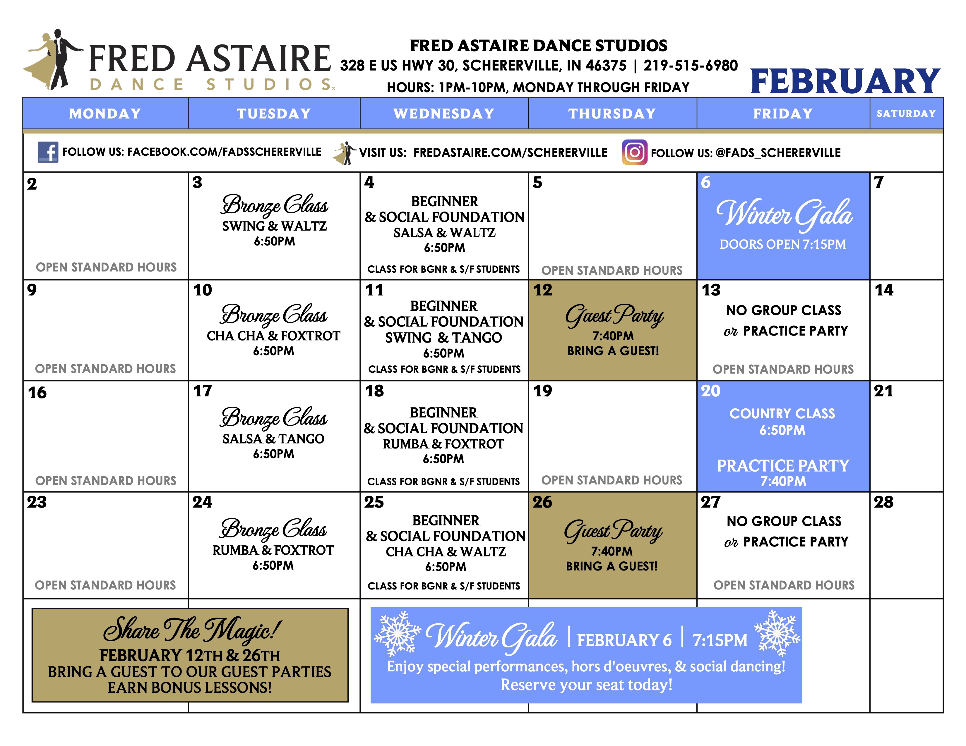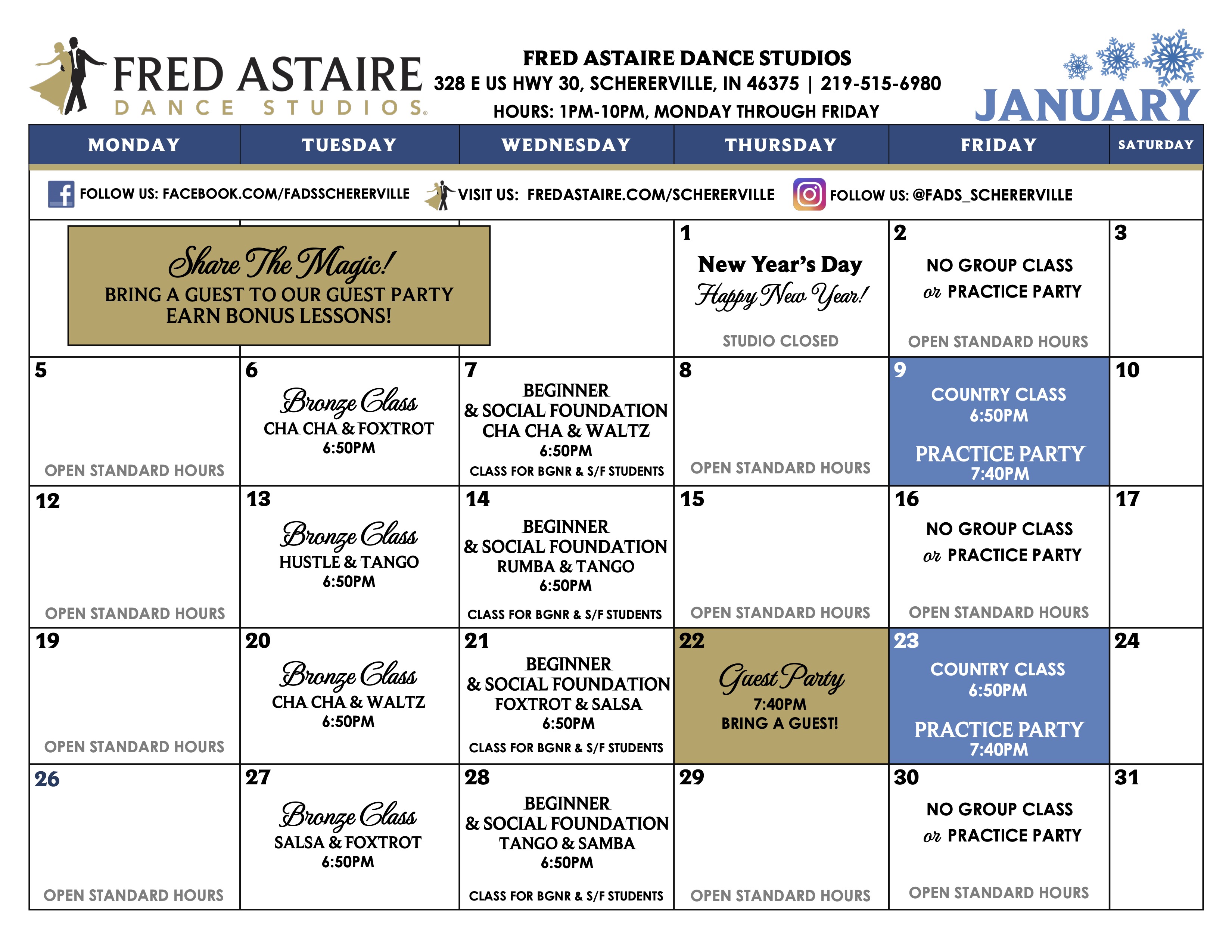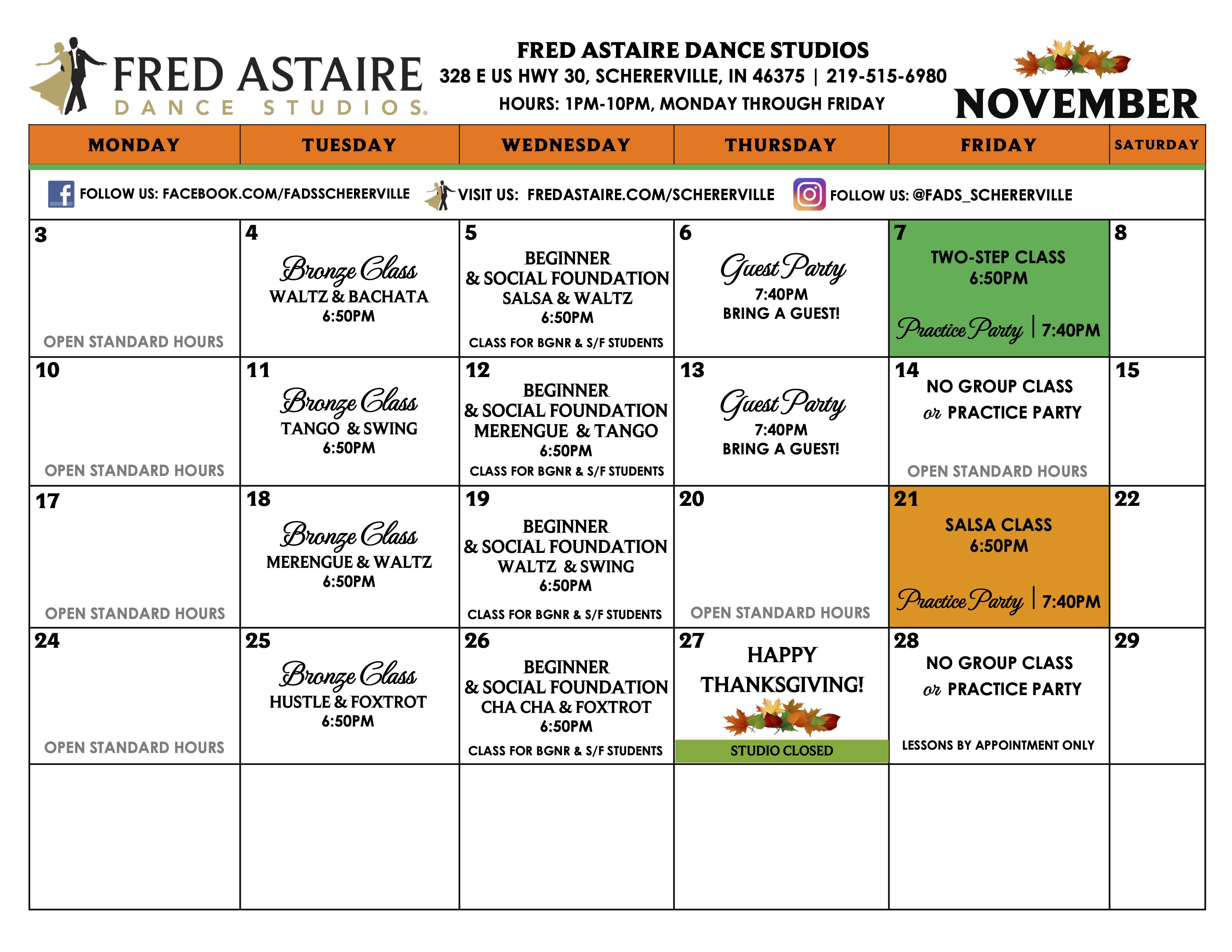 Check out this month’s schedule of Group Classes, Practice Parties and Special Events at our Studio. Come with a dance partner or by yourself.