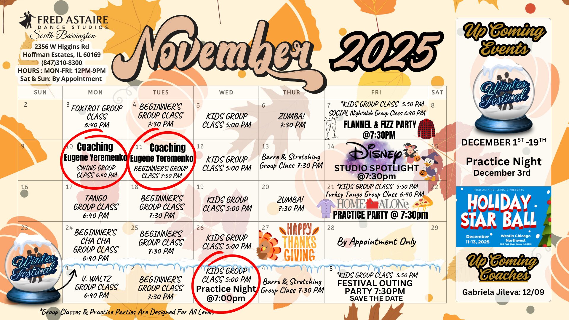 Check out this month’s schedule of Group Classes, Practice Parties and Special Events at our Studio. Come with a dance partner or by yourself. For more information and to join us, just give us a call! 847-310-8300