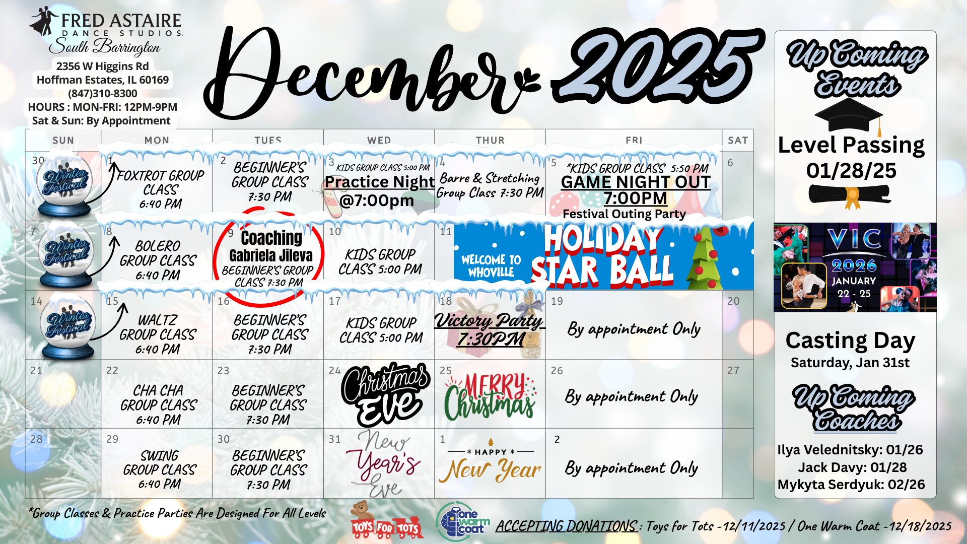 Check out this month’s schedule of Group Classes, Practice Parties and Special Events at our Studio. Come with a dance partner or by yourself. For more information and to join us, just give us a call! 847-310-8300