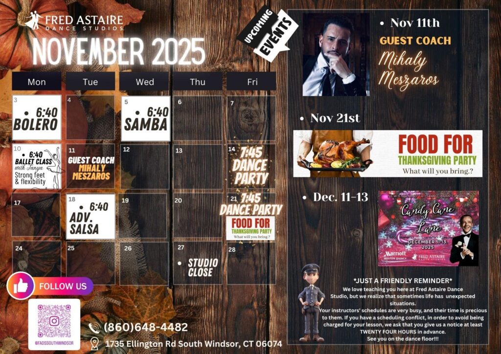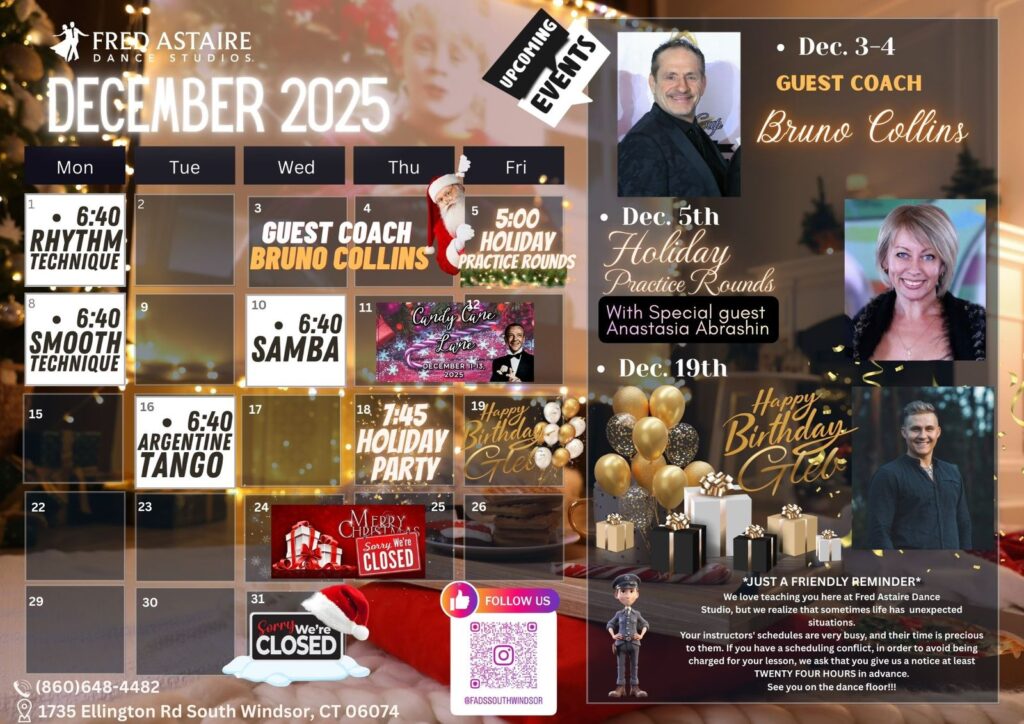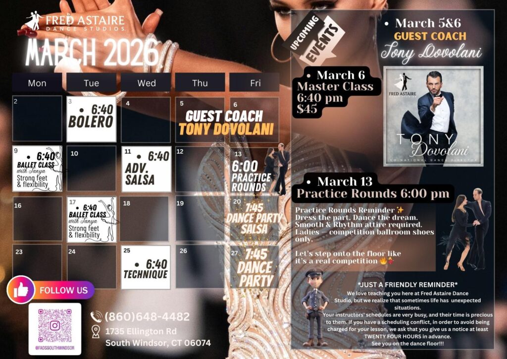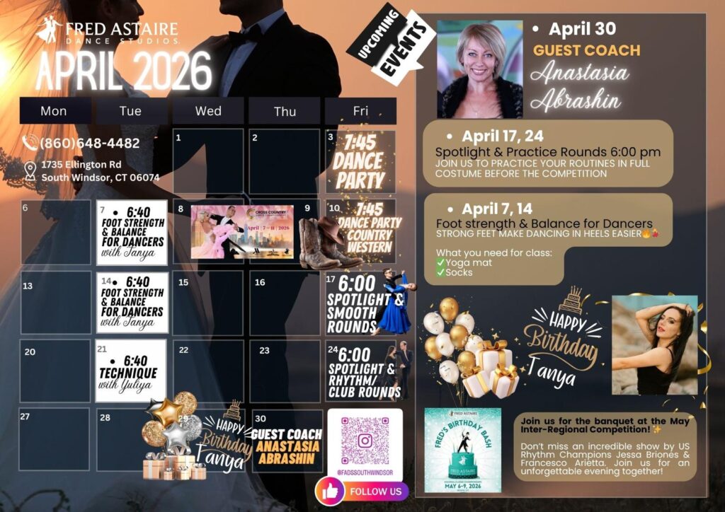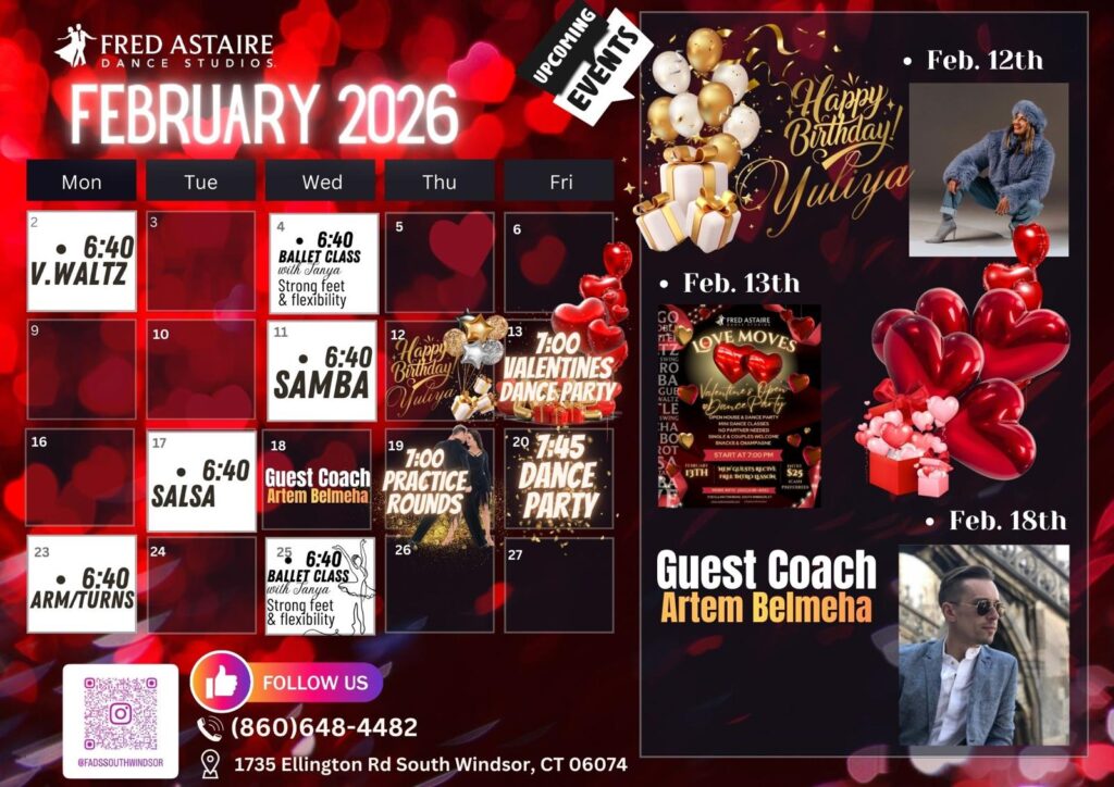 Check out this month’s schedule of Group Classes, Practice Parties and Special Events at our Studio. Come with a dance partner or by yourself. For more information and to join us, just give us a call at 860-648-4482