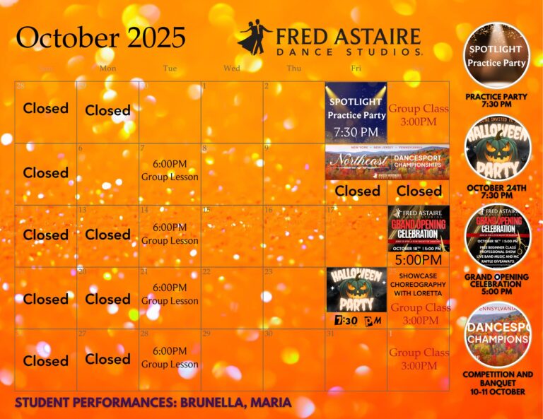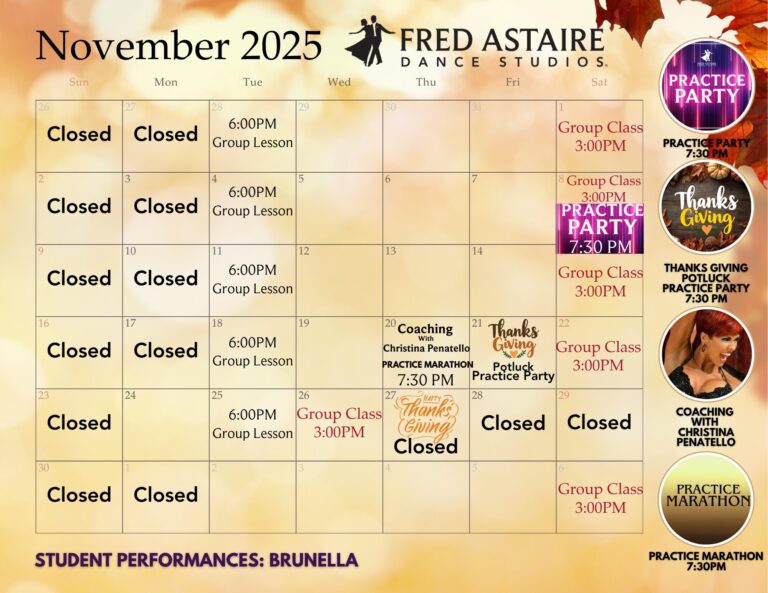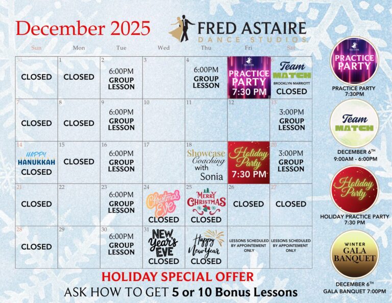 Check out this month’s schedule of Group Classes, Practice Parties and Special Events at our Studio. Come with a dance partner or by yourself. For more information and to join us, just give us a call!
