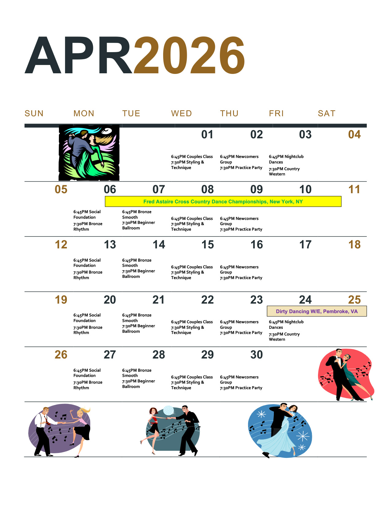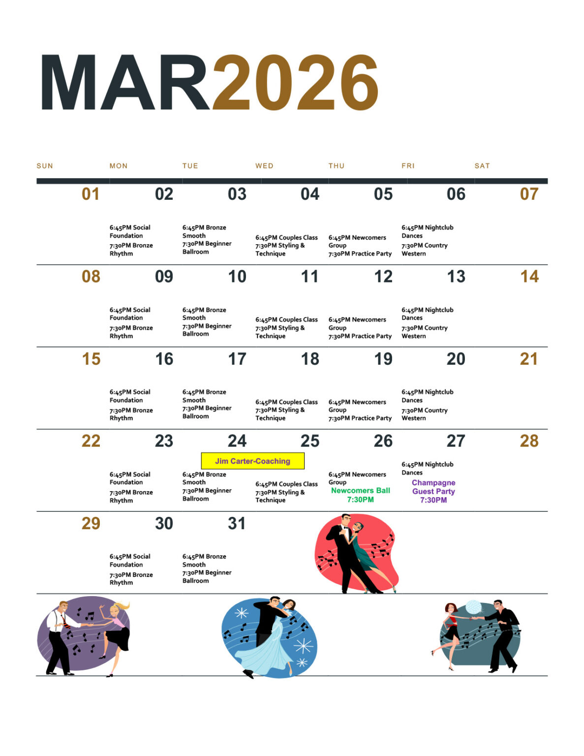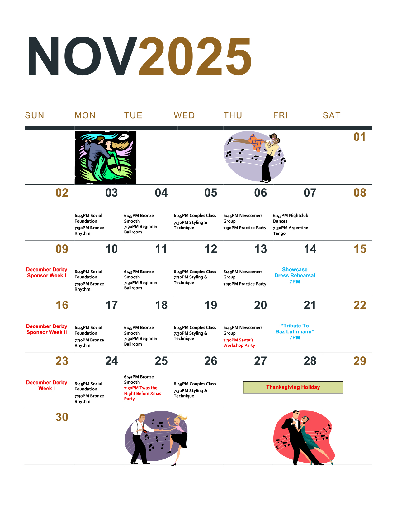 Check out this month’s schedule of Group Classes, Practice Parties and Special Events at our Studio. Come with a dance partner or by yourself. For more information and to join us, just give us a call!