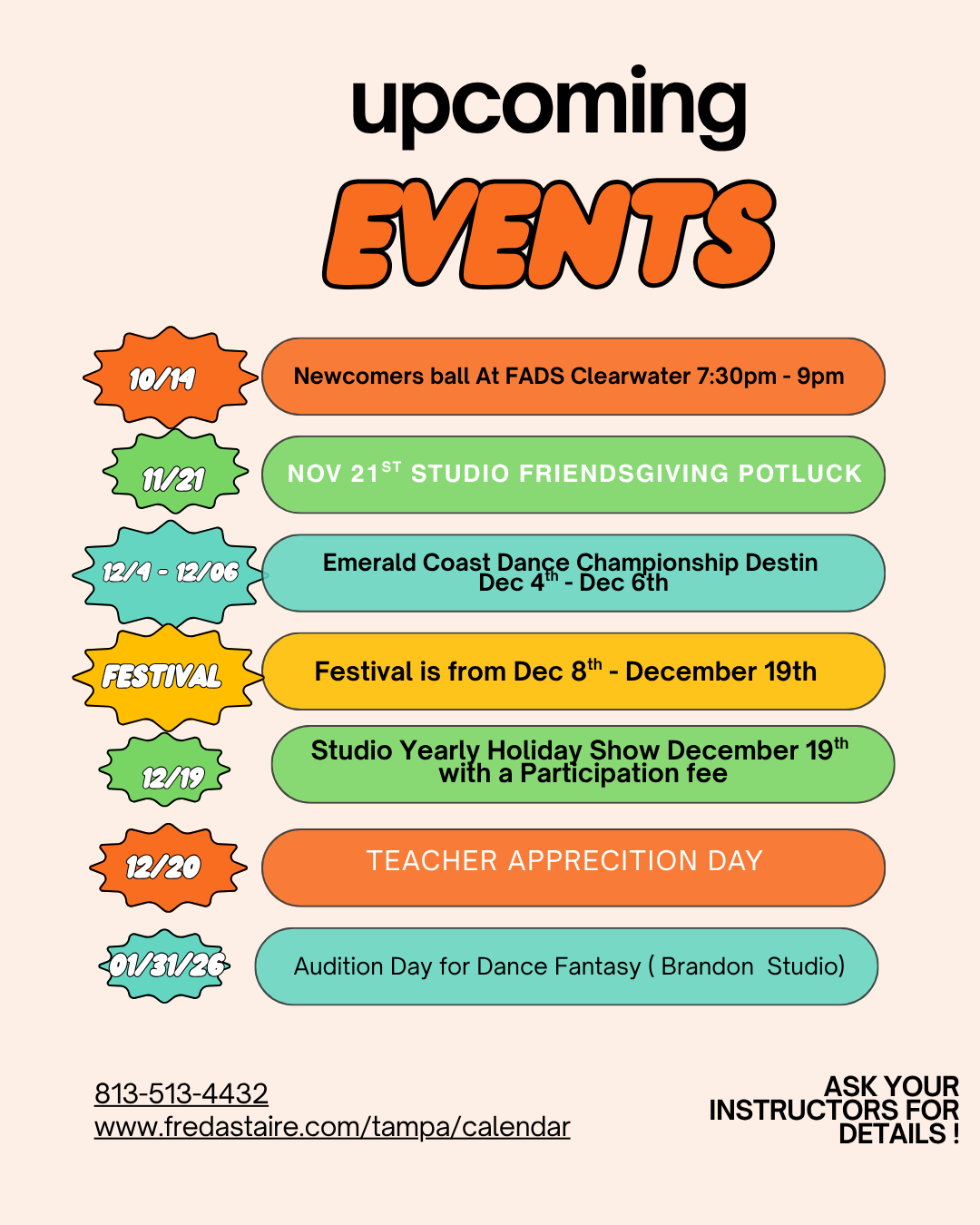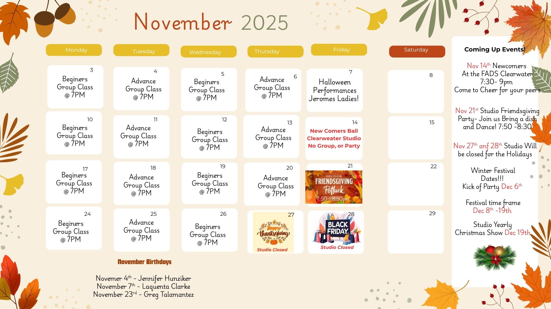 Our Tampa Dance Studio offers private and group dance lessons, studio practice parties, and much more! Check out this month’s calendar below and make sure to pick up a copy in the studio.