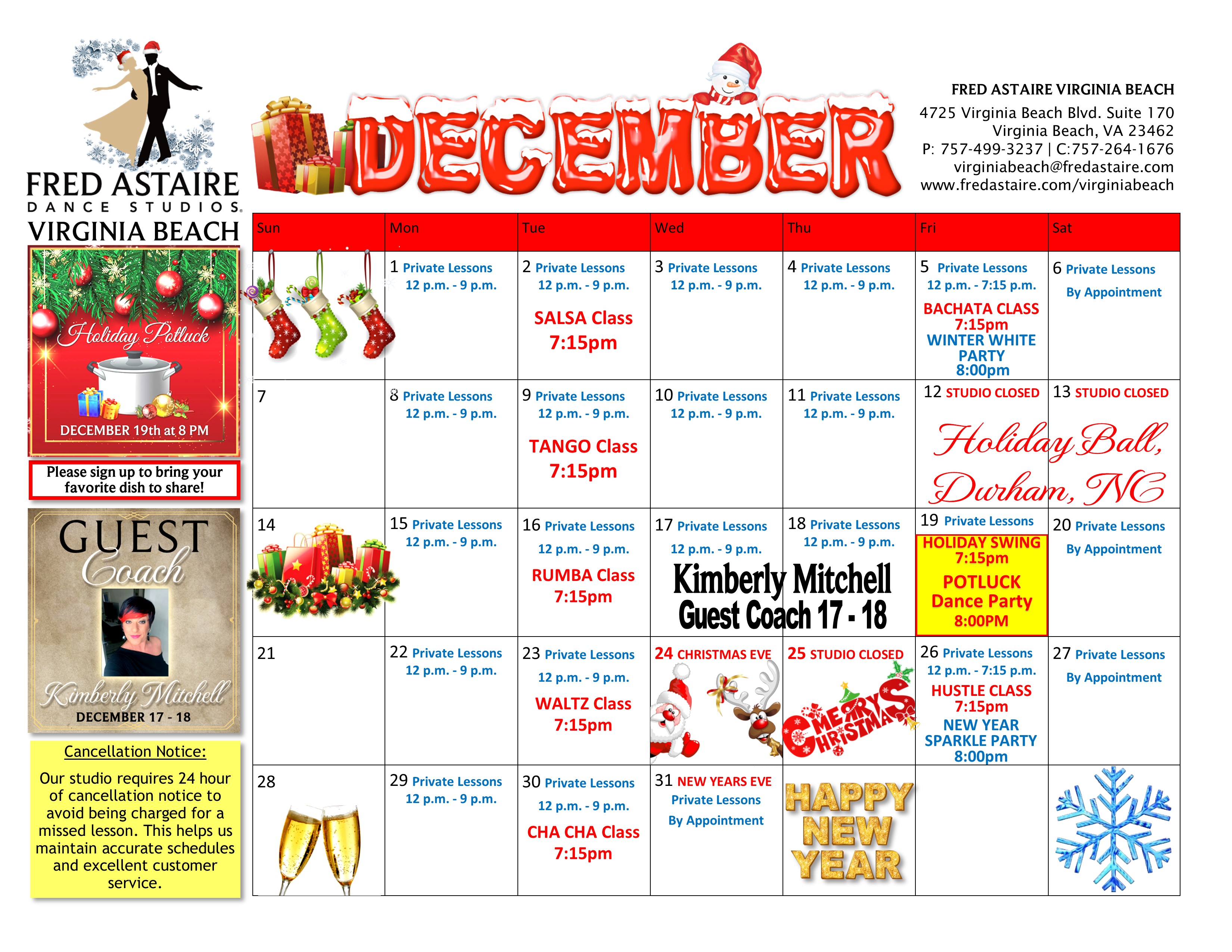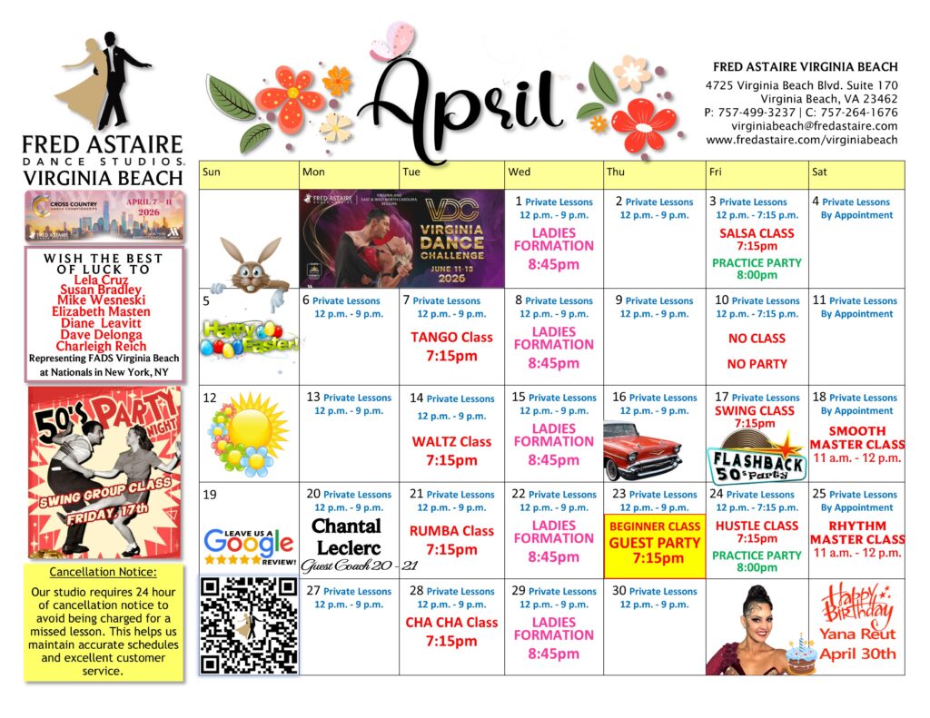 Check out this month’s schedule of Group Classes, Practice Parties and Special Events at our Studio. Come with a dance partner or by yourself. For more information and how to join us, just give us a call!