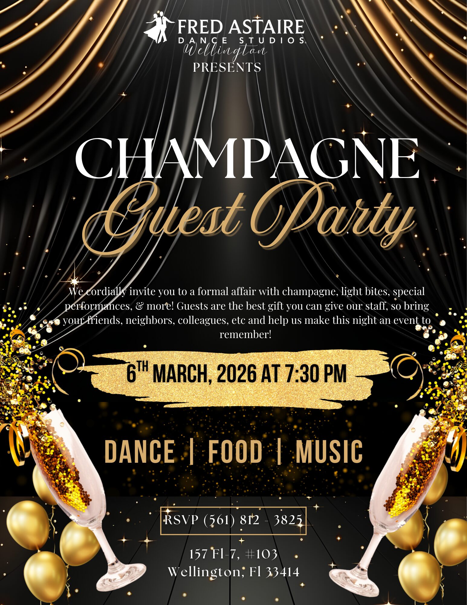 Step into an evening of elegance, connection, and celebration at Fred Astaire Dance Studios – Wellington on March 6 from 7:30-9:00p. Our Champagne Guest Party is more than a social—it’s a showcase of our dance family and the perfect opportunity to share what you love with someone special to you. We’ll be trying a new format this time, so don’t miss this spectacular event!