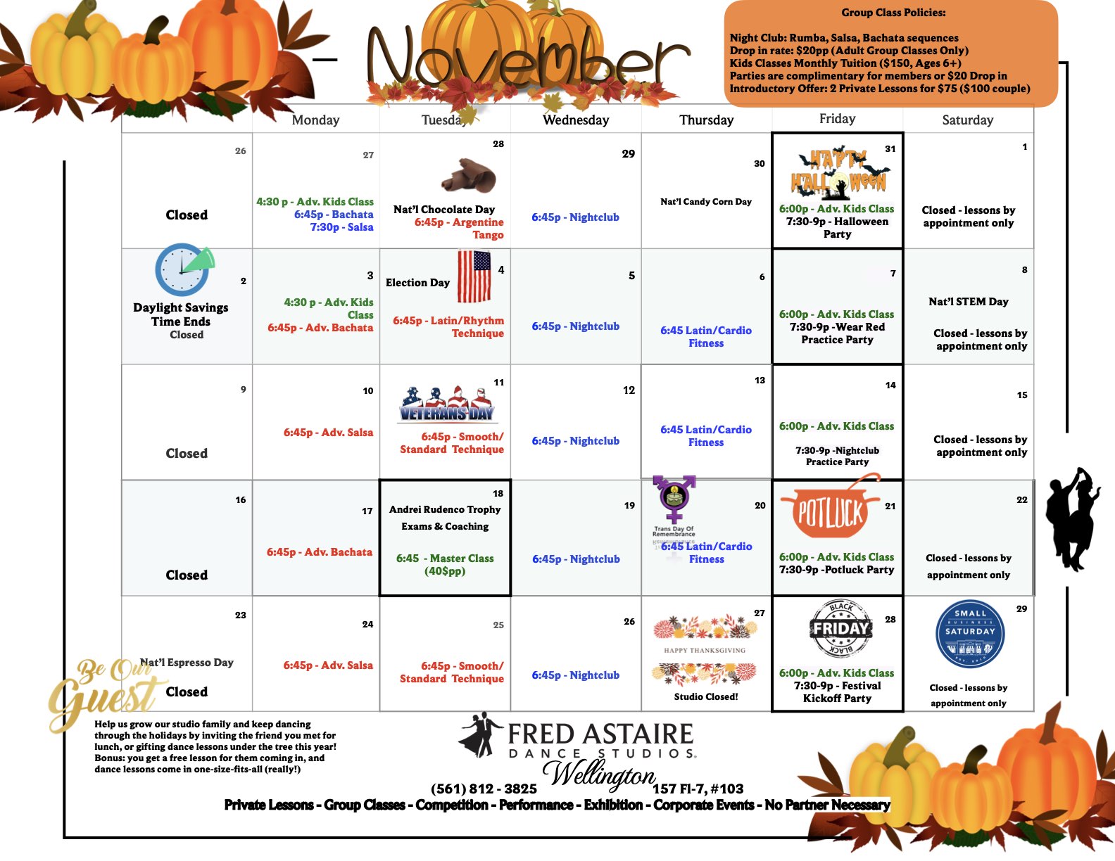 Check out this month’s schedule of Group Classes, Practice Parties and Special Events at our Studio. No partners necessary (although they are welcome!) and no experience required. Our fantastic, friendly instructors are certified and trained to teach students of all levels in almost any style of dance you can imagine – group classes are only the beginning! Come see why FADS – Wellington is the best place to learn to dance in Palm Beach!