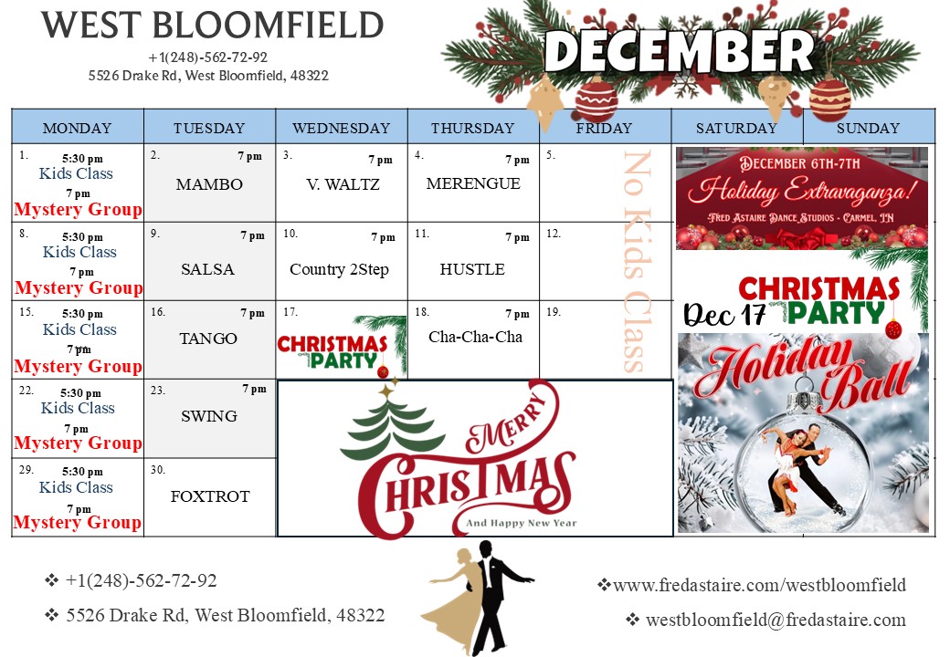 Below you will find a monthly calendar of events, group classes, practices parties and more at our new West Bloomfield dance studio!