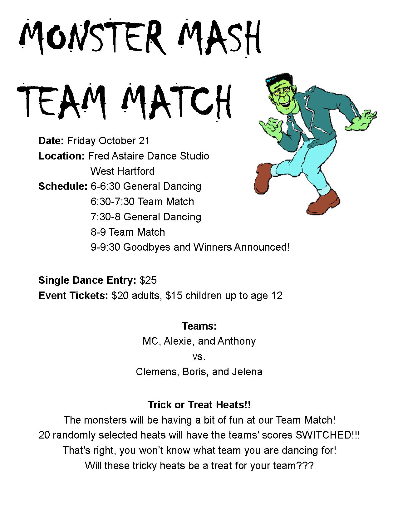 On Friday, Oct. 21, we will be having our Monster Mash Team Match from 6-9:30 p.m. People who wish to participate need to sign up and pay for the heats they want to dance at the front desk. Single dance entry is $25. It is a ticketed event ($20 adults, $15 children up to the age of 12), so everyone planning on attending must purchase tickets ahead of time. This will be our Halloween party as well, so people should wear their Halloween costumes. And it is also a potluck event, so people can bring snacks to share with everyone. That is one full evening to cap a very full month at your Fred Astaire of West Hartford Dance Studio.