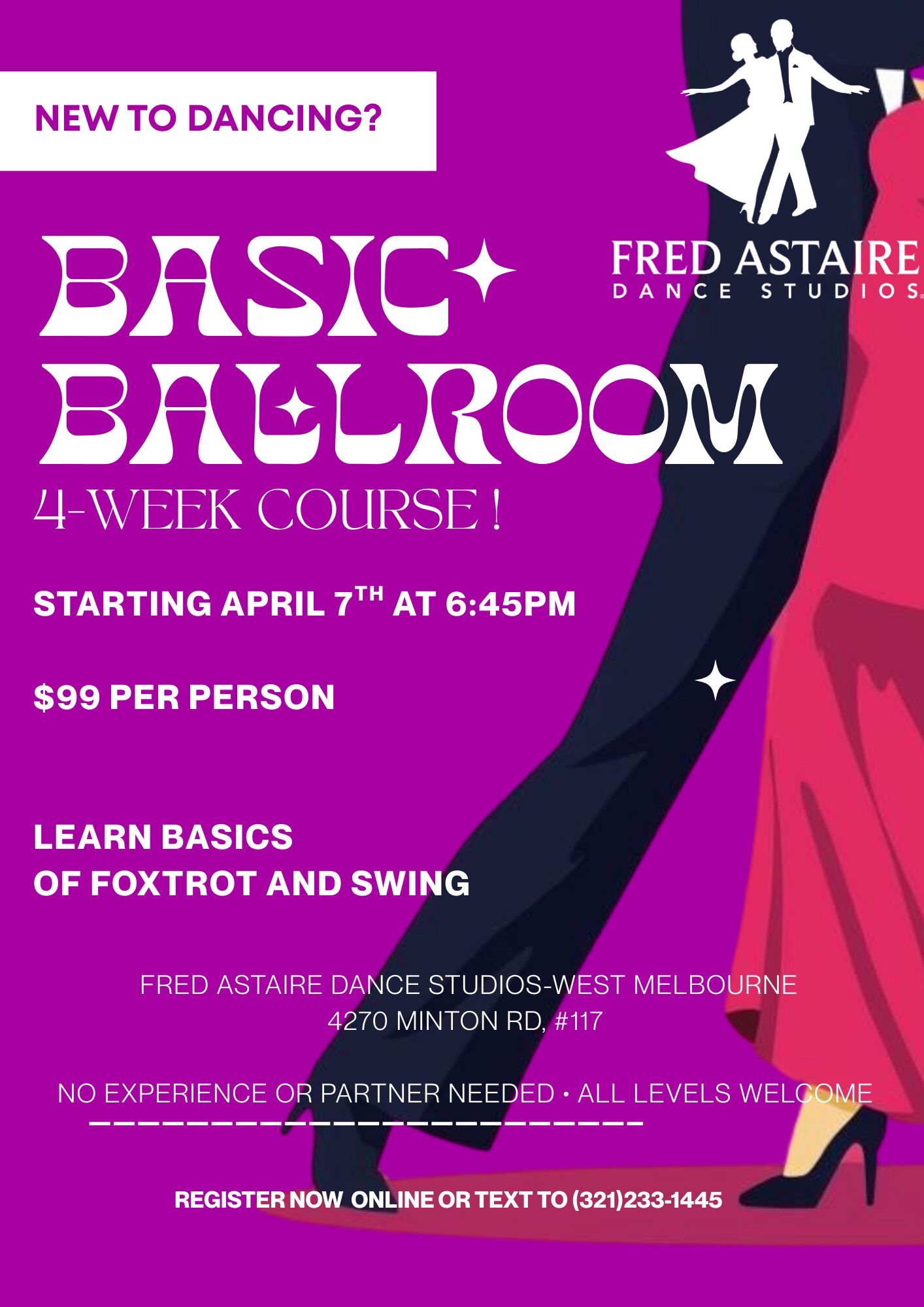 Join us at Fred Astaire Dance Studio – West Melbourne for our 4-Week Basic Ballroom Course, designed specifically for beginners. In a fun and welcoming environment, you’ll learn the fundamentals of two of the most popular social dances — Foxtrot and Swing.